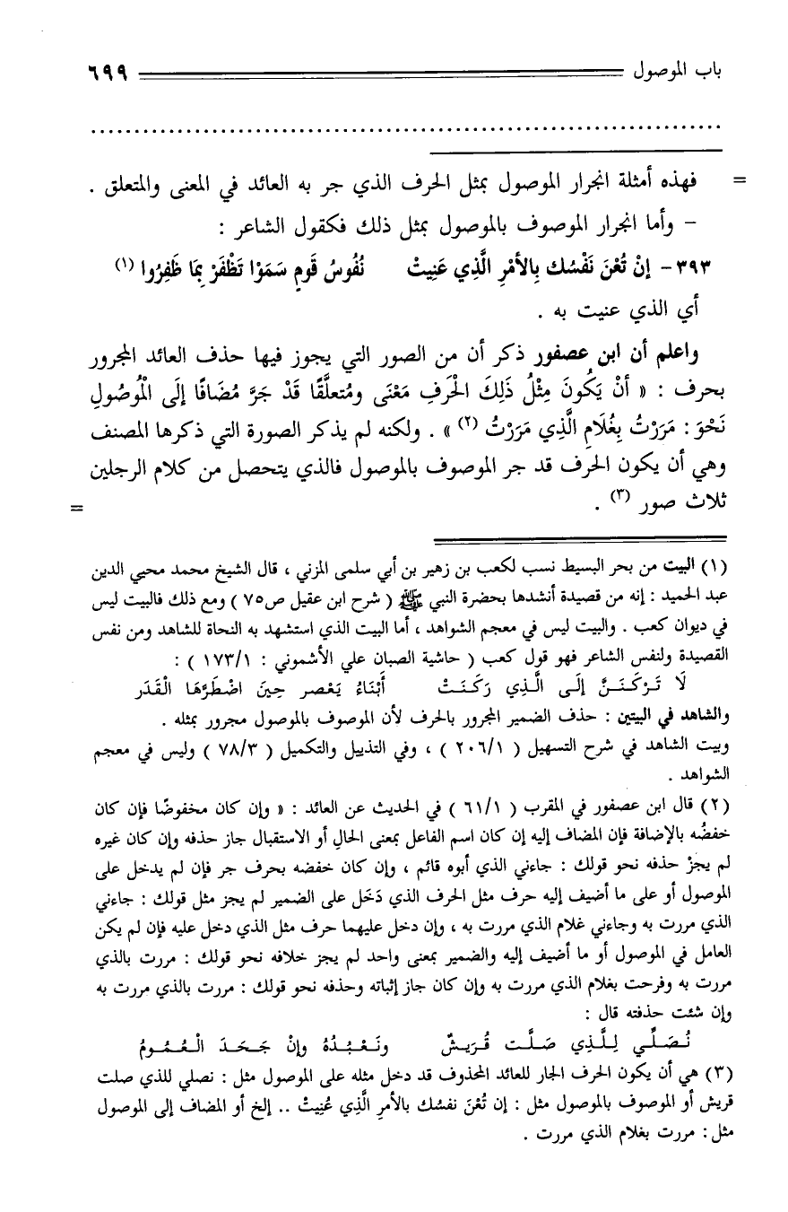 (¬2) قال ابن عصفور في المقرب (1/ 61) في الحديث عن العائد: «وإن كان مخفوضا فإن كان خفضه بالإضافة فإن المضاف إليه إن كان اسم الفاعل بمعنى الحال أو الاستقبال جاز حذفه وإن كان غيره لم يجز حذفه نحو قولك: جاءني الذي أبوه قائم، وإن كان خفضه بحرف جر فإن لم يدخل على الموصول أو على ما أضيف إليه حرف مثل الحرف الذي دخل على الضمير لم يجز مثل قولك: جاءني الذي مررت به وجاءني غلام الذي مررت به، وإن دخل عليهما حرف مثل الذي دخل عليه فإن لم يكن العامل في الموصول أو ما أضيف إليه والضمير بمعنى واحد لم يجز خلافه نحو قولك: مررت بالذي مررت به وفرحت بغلام الذي مررت به وإن كان جاز إثباته وحذفه نحو قولك: مررت بالذي مررت به وإن شئت حذفته قال: