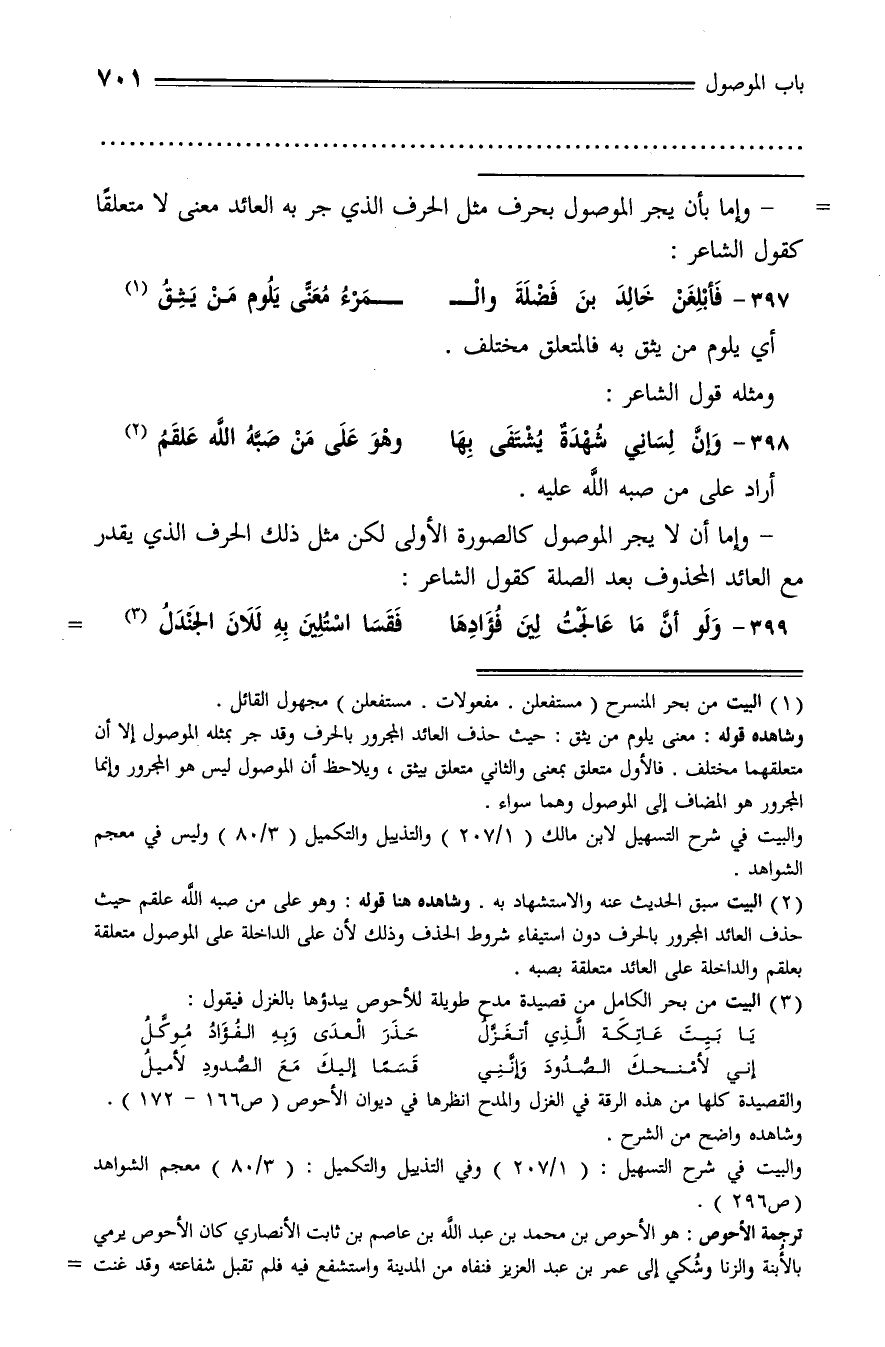 وشاهده قوله: معنى يلوم من يثق: حيث حذف العائد المجرور بالحرف وقد جر بمثله الموصول إلا أن متعلقهما مختلف. فالأول متعلق بمعنى والثاني متعلق بيثق، ويلاحظ أن الموصول ليس هو المجرور وإنما المجرور هو المضاف إلى الموصول وهما سواء.