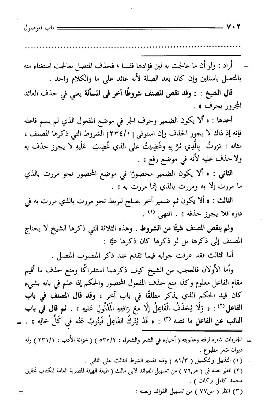 أحدها: «ألا يكون الضمير وحرف الجر في موضع المفعول الذي لم يسم فاعله فإنه إذ ذاك لا يجوز الحذف وإن استوفى [1/ 234] الشروط التي ذكرها المصنف، مثاله: مررت بالّذي مرّ به وغضبت على الذي غضب عليه لا يجوز حذف به ولا حذف عليه لأنه في موضع رفع».