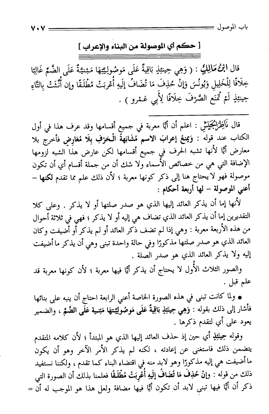 قال ناظر الجيش: اعلم أن أيّا معربة في جميع أقسامها وقد عرف هذا في أول الكتاب عند قوله: ويمنع إعراب الاسم مشابهة الحرف بلا معارض فأخرج بلا معارض أيّا لأنها تشبه الحرف في جميع أقسامها لكن عارض هذا الشبه لزومها الإضافة التي هي من خصائص الأسماء ولا شك أن من جملة أقسام أي أن تكون موصولة فهو لا يحتاج هنا إلى ذكر كونها معربة؛ لأن ذلك علم مما تقدم لكنها - أعني الموصولة - لها أربعة أحكام: