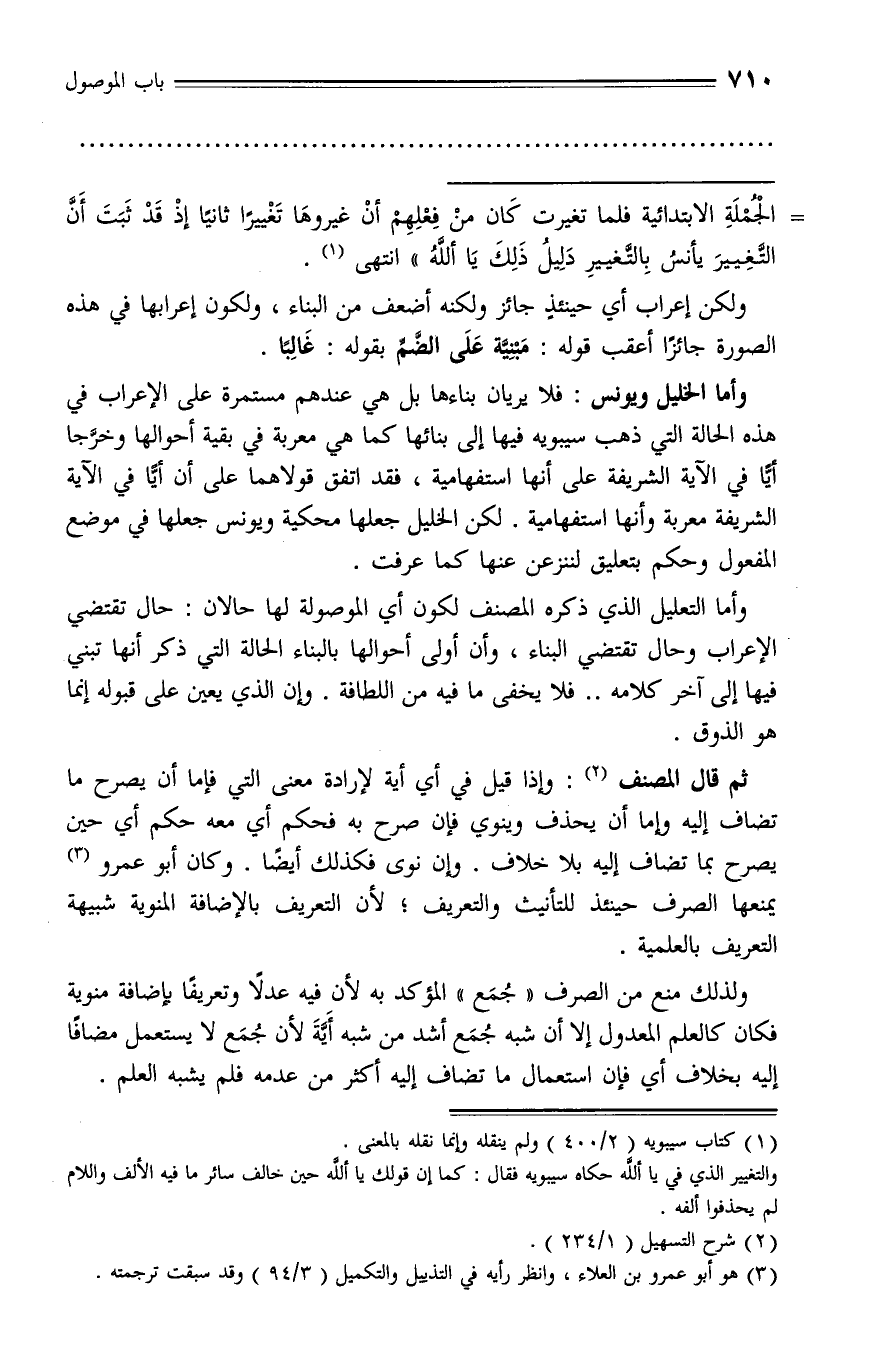 وأما التعليل الذي ذكره المصنف لكون أي الموصولة لها حالان: حال تقتضي الإعراب وحال تقتضي البناء، وأن أولى أحوالها بالبناء الحالة التي ذكر أنها تبني فيها إلى آخر كلامه .. فلا يخفى ما فيه من اللطافة. وإن الذي يعين على قبوله إنما هو الذوق.