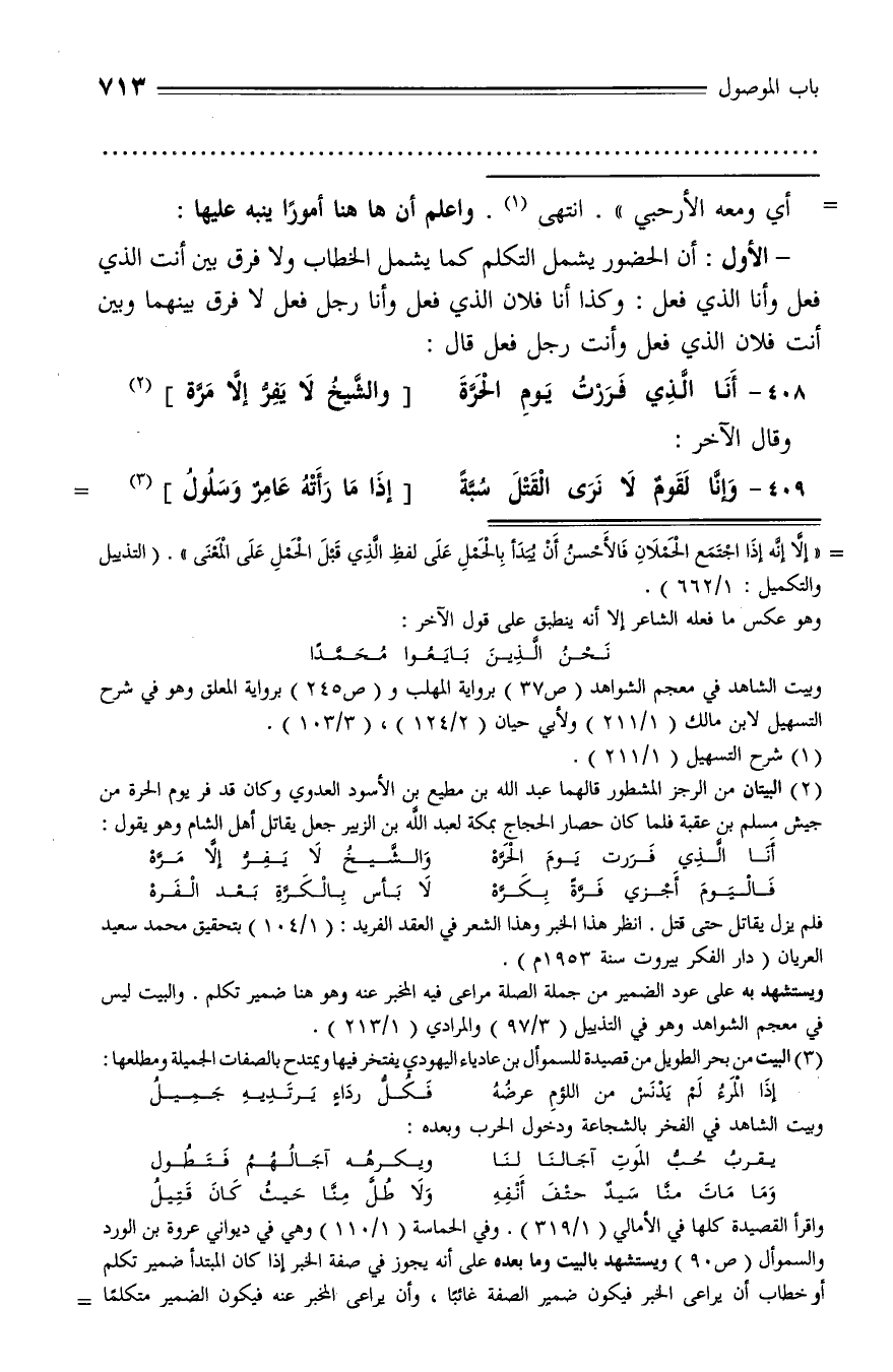 - الأول: أن الحضور يشمل التكلم كما يشمل الخطاب ولا فرق بين أنت الذي فعل وأنا الذي فعل: وكذا أنا فلان الذي فعل وأنا رجل فعل لا فرق بينهما وبين أنت فلان الذي فعل وأنت رجل فعل قال: