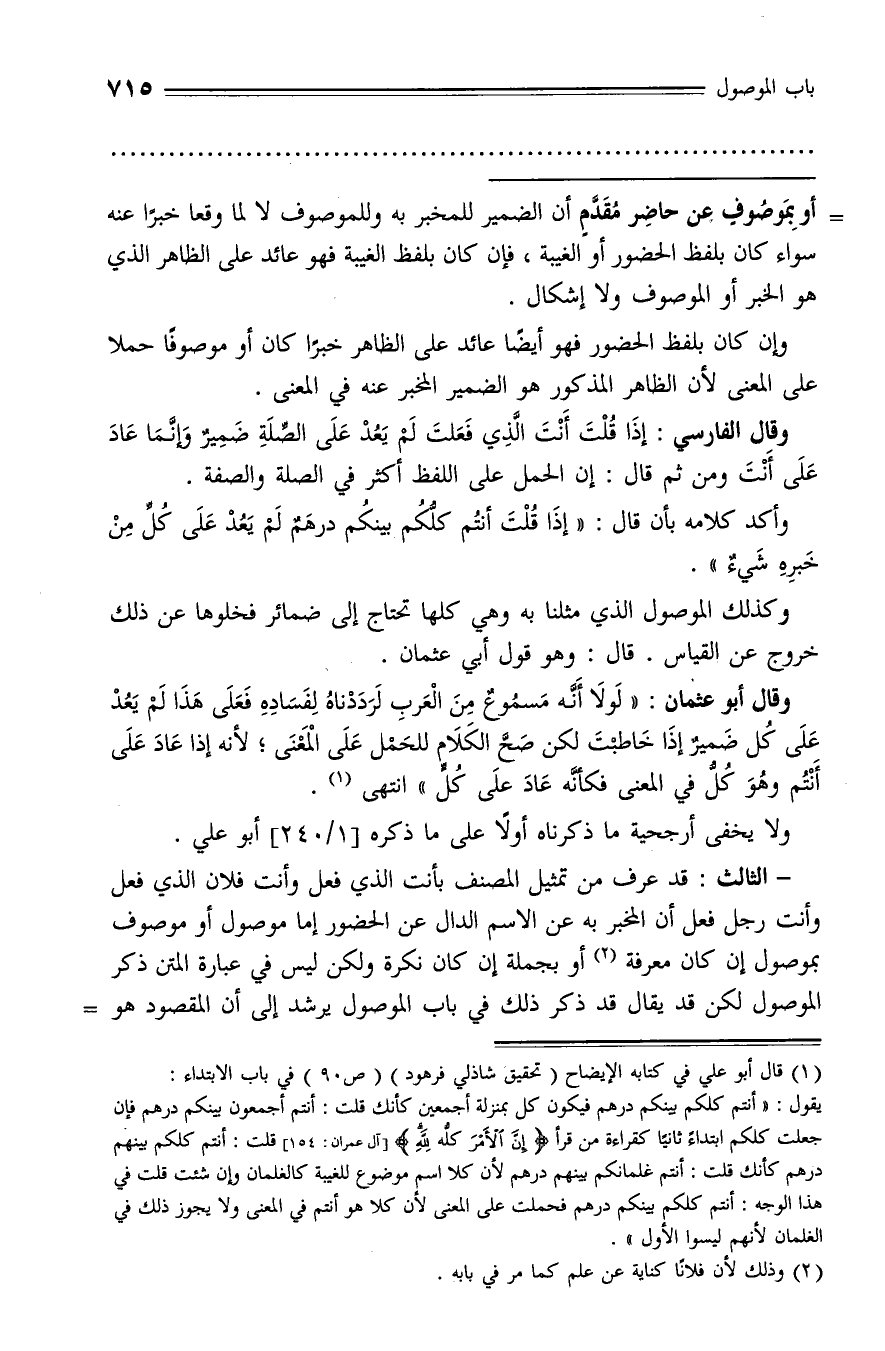 وقال الفارسي: إذا قلت أنت الّذي فعلت لم يعد على الصّلة ضمير وإنّما عاد على أنت ومن ثم قال: إن الحمل على اللفظ أكثر في الصلة والصفة.