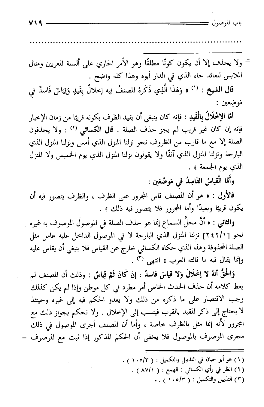 والثاني: «أنّ محلّ السماع إنما هو حذف الصلة في الموصول الموصوف به غيره نحو [1/ 242] نزلنا المنزل الذي البارحة لا في الموصول الداخل عليه عامل مثل الصلة المحذوفة وهذا الذي حكاه الكسائي خارج عن القياس فلا ينبغي أن يقاس عليه وإنما يقال فيه ما قالته العرب» انتهى (¬3).