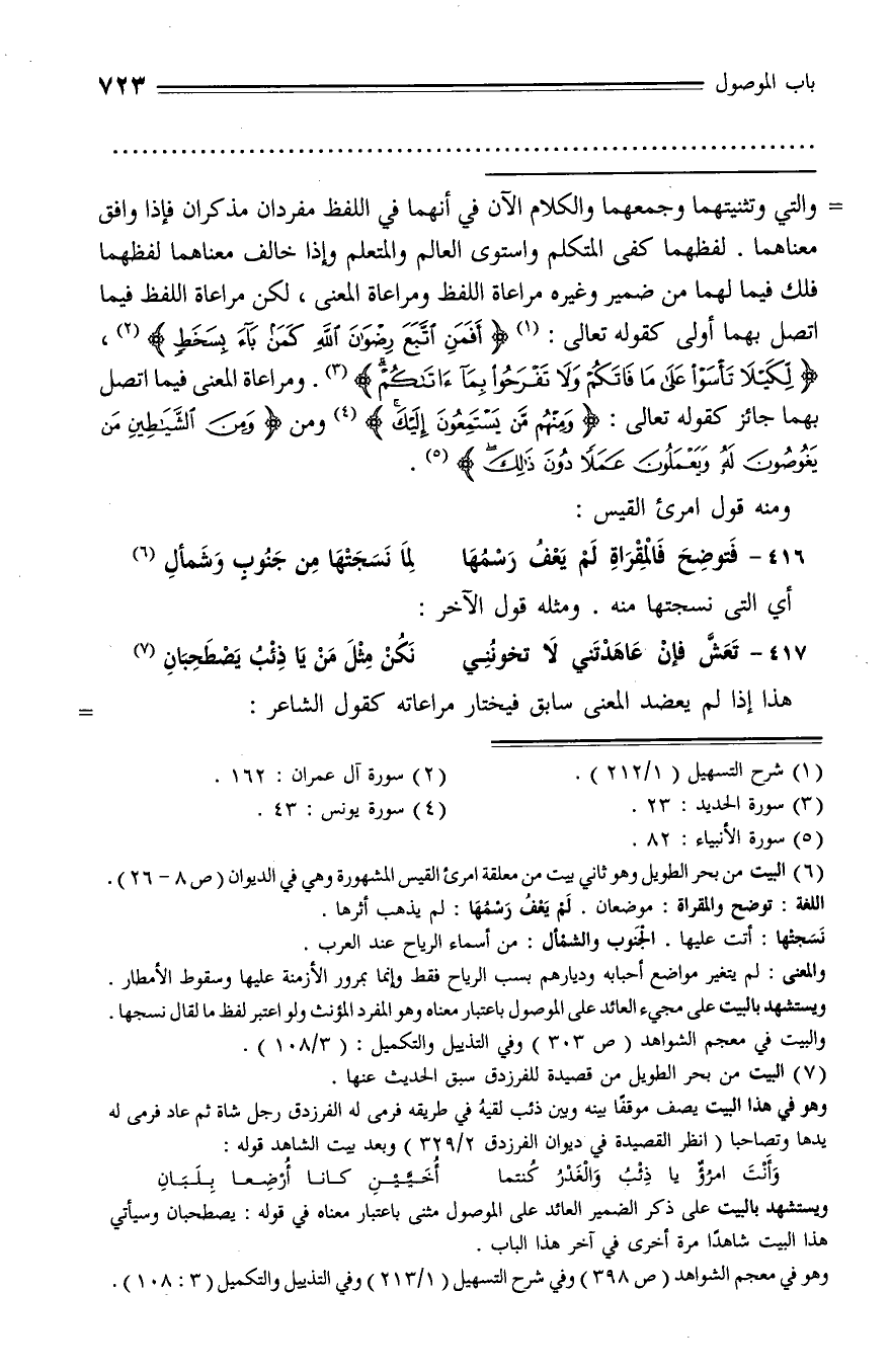والتي وتثنيتهما وجمعهما والكلام الآن في أنهما في اللفظ مفردان مذكران فإذا وافق معناهما. لفظهما كفى المتكلم واستوى العالم والمتعلم وإذا خالف معناهما لفظهما فلك فيما لهما من ضمير وغيره مراعاة اللفظ ومراعاة المعنى، لكن مراعاة اللفظ فيما اتصل بهما أولى كقوله تعالى: (¬1) أَفَمَنِ اتَّبَعَ رِضْوانَ اللَّهِ كَمَنْ باءَ بِسَخَطٍ (¬2)، لِكَيْلا تَأْسَوْا عَلى ما فاتَكُمْ وَلا تَفْرَحُوا بِما آتاكُمْ (¬3). ومراعاة المعنى فيما اتصل بهما جائز كقوله تعالى: وَمِنْهُمْ مَنْ يَسْتَمِعُونَ إِلَيْكَ (¬4) ومن وَمِنَ الشَّياطِينِ مَنْ يَغُوصُونَ لَهُ وَيَعْمَلُونَ عَمَلًا دُونَ ذلِكَ (¬5).