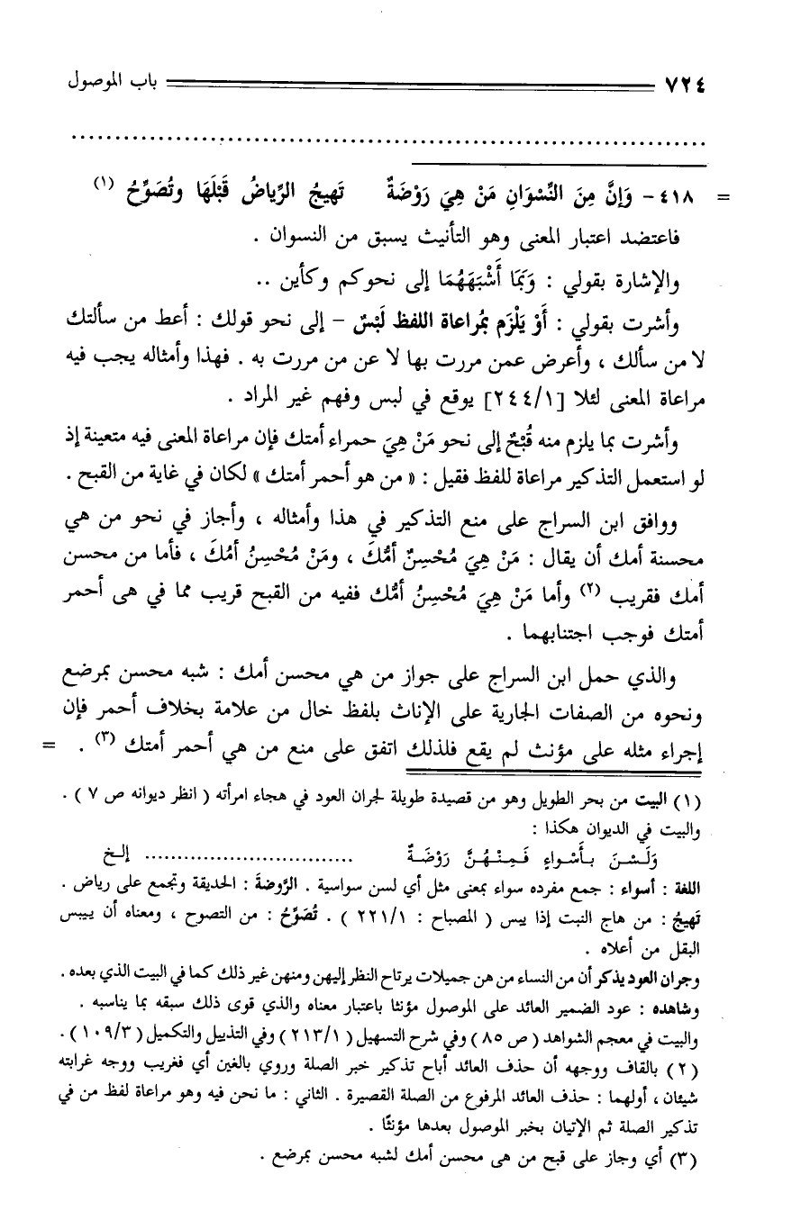 (¬2) بالقاف ووجهه أن حذف العائد أباح تذكير خبر الصلة وروي بالغين أي فغريب ووجه غرابته شيئان، أولهما: حذف العائد المرفوع من الصلة القصيرة. الثاني: ما نحن فيه وهو مراعاة لفظ من في تذكير الصلة ثم الإتيان بخبر الموصول بعدها مؤنثا.