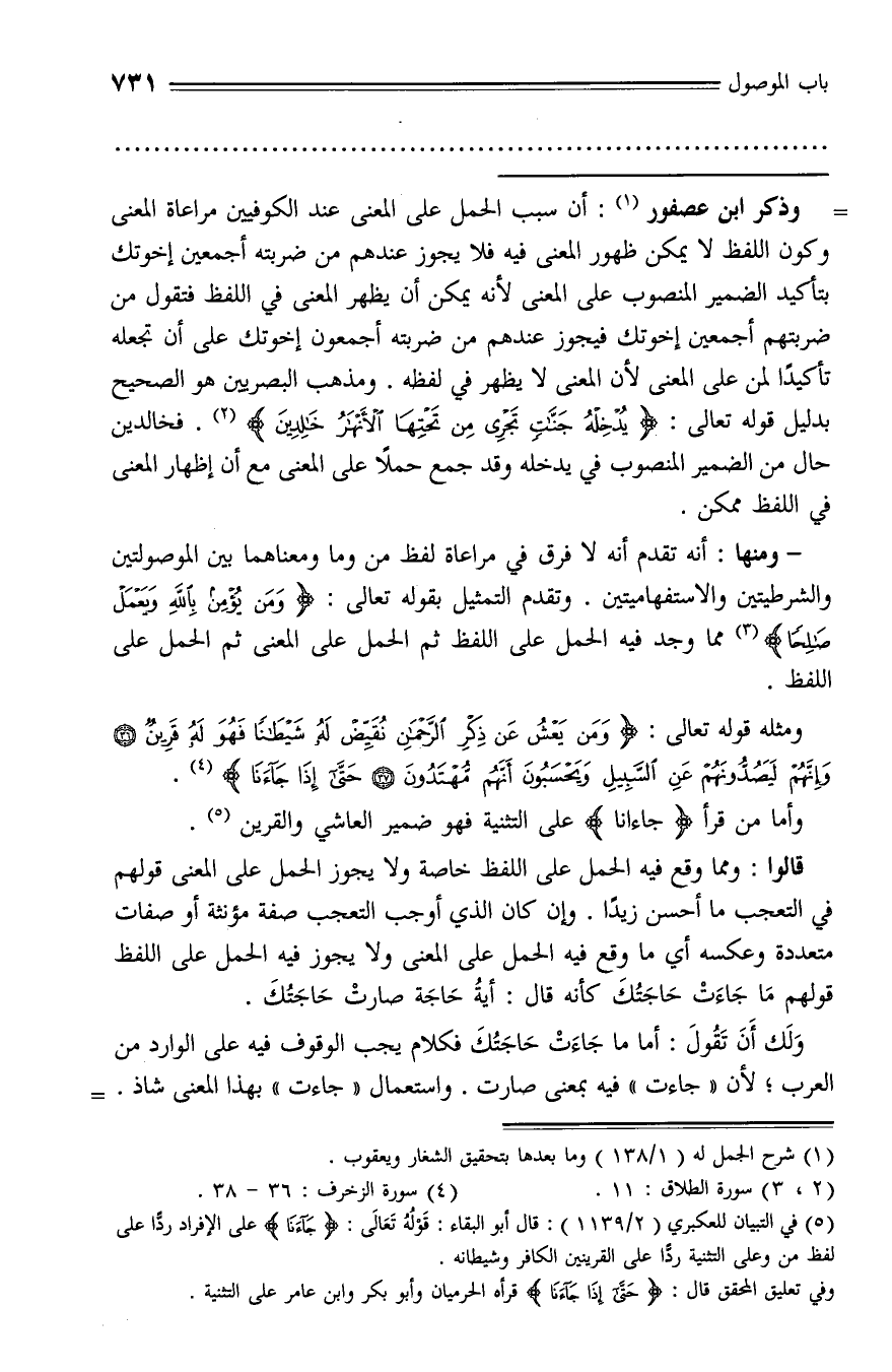- ومنها: أنه تقدم أنه لا فرق في مراعاة لفظ من وما ومعناهما بين الموصولتين والشرطيتين والاستفهاميتين. وتقدم التمثيل بقوله تعالى: وَمَنْ يُؤْمِنْ بِاللَّهِ وَيَعْمَلْ صالِحاً (¬3) مما وجد فيه الحمل على اللفظ ثم الحمل على المعنى ثم الحمل على اللفظ.