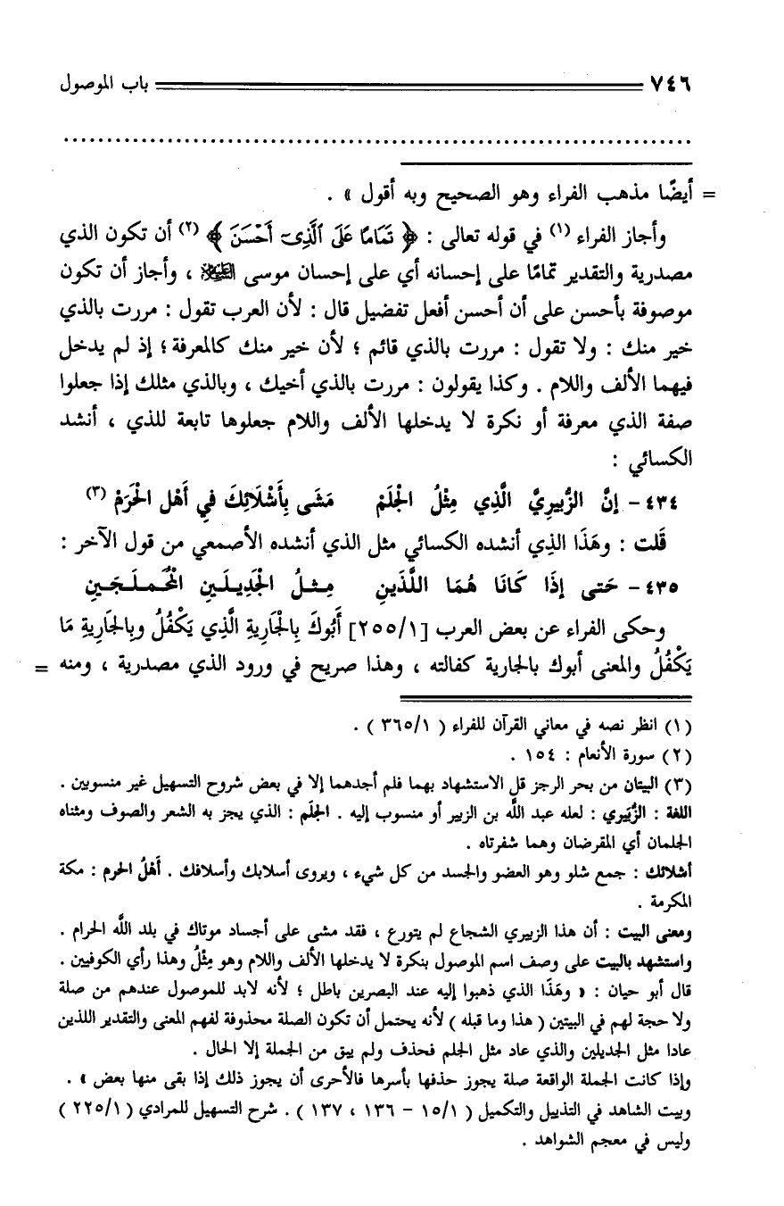 وأجاز الفراء (¬1) في قوله تعالى: تَماماً عَلَى الَّذِي أَحْسَنَ (¬2) أن تكون الذي مصدرية والتقدير تماما على إحسانه أي على إحسان موسى عليه السّلام، وأجاز أن تكون موصوفة بأحسن على أن أحسن أفعل تفضيل قال: لأن العرب تقول: مررت بالذي خير منك: ولا تقول: مررت بالذي قائم؛ لأن خير منك كالمعرفة؛ إذ لم يدخل فيهما الألف واللام. وكذا يقولون: مررت بالذي أخيك، وبالذي مثلك إذا جعلوا صفة الذي معرفة أو نكرة لا يدخلها الألف واللام جعلوها تابعة للذي، أنشد الكسائي: