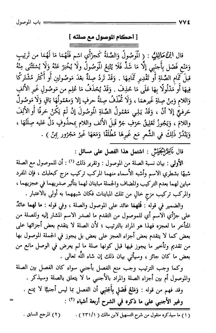 قال ابن مالك: (الموصول والصّلة كجزأي اسم فلهما ما لهما من ترتيب ومنع فصل بأجنبي إلّا ما شذّ فلا يتبع الموصول ولا يخبر عنه ولا يستثنى منه قبل تمام الصّلة أو تقدير تمامها. وقد ترد صلة بعد موصولين أو أكثر مشتركا فيها أو مدلولا بها على ما حذف. وقد يحذف ما علم من موصول غير الألف واللام ومن صلة غيرهما، ولا تحذف صلة حرف إلا ومعمولها باق ولا موصول حرفيّ إلا أن، وقد يلي معمول الصّلة الموصول إن لم يكن حرفا أو الألف واللام، ويجوز تعليق حرف جرّ قبل الألف واللام بمحذوف دلّ عليه صلتها، ويندر ذلك في الشّعر مع غيرها مطلقا ومعها غير مجرور بمن).