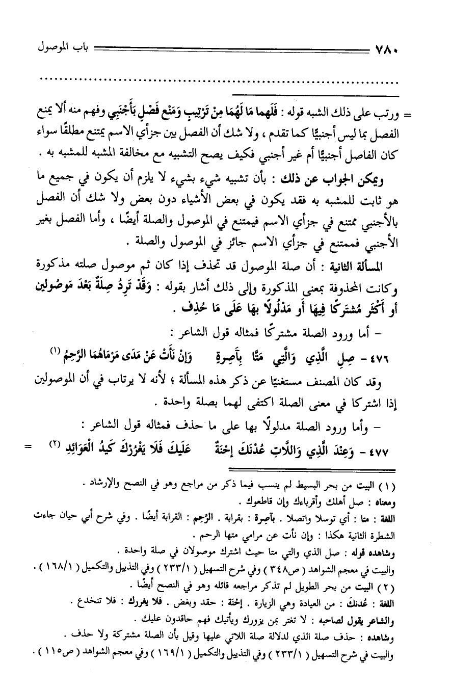 المسألة الثانية: أن صلة الموصول قد تحذف إذا كان ثم موصول صلته مذكورة وكانت المحذوفة بمعنى المذكورة وإلى ذلك أشار بقوله: وقد ترد صلة بعد موصولين أو أكثر مشتركا فيها أو مدلولا بها على ما حذف.