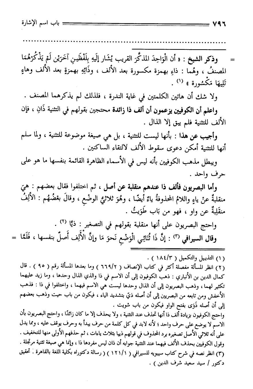 واعلم أن الكوفيين يزعمون أن ألف ذا زائدة محتجين بقولهم في التثنية ذان، فإن الألف للتثنية فلم يبق إلا الذال.