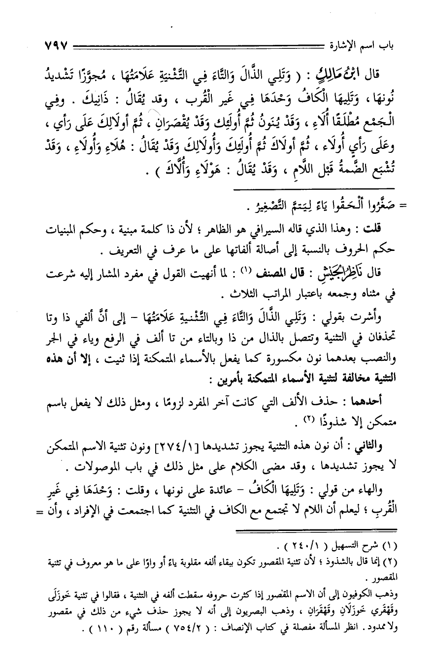 وأشرت بقولي: وتلي الذّال والتّاء في التّثنية علامتها - إلى أنّ ألفي ذا وتا تحذفان في التثنية وتتصل بالذال من ذا وبالتاء من تا ألف في الرفع وياء في الجر والنصب بعدهما نون مكسورةكما يفعل بالأسماء المتمكنة إذا ثنيت، إلا أن هذه التثنية مخالفة لتثنية الأسماء المتمكنة بأمرين: