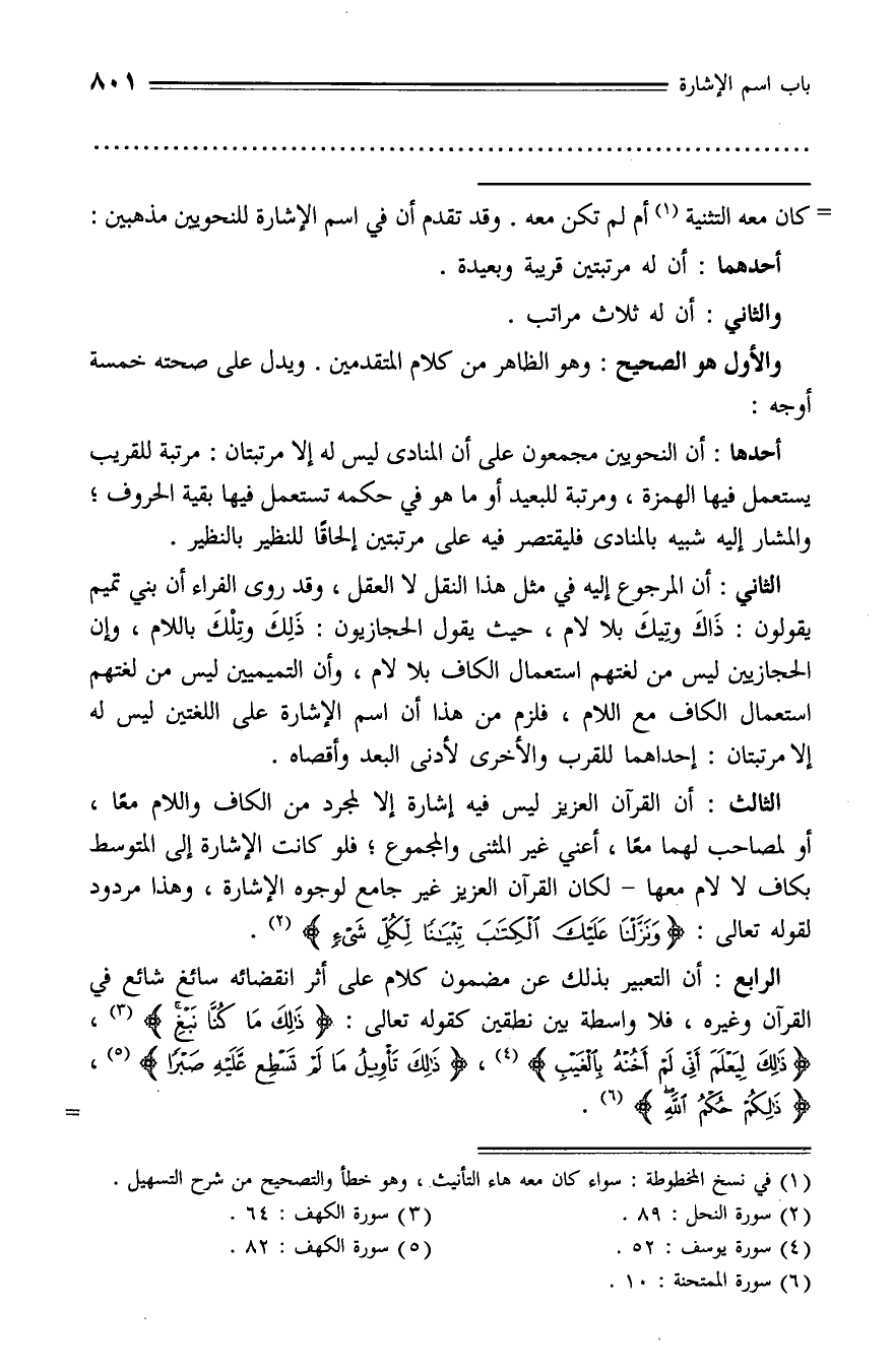 أحدها: أن النحويين مجمعون على أن المنادى ليس له إلا مرتبتان: مرتبة للقريب يستعمل فيها الهمزة، ومرتبة للبعيد أو ما هو في حكمه تستعمل فيها بقية الحروف؛ والمشار إليه شبيه بالمنادى فليقتصر فيه على مرتبتين إلحاقا للنظير بالنظير.