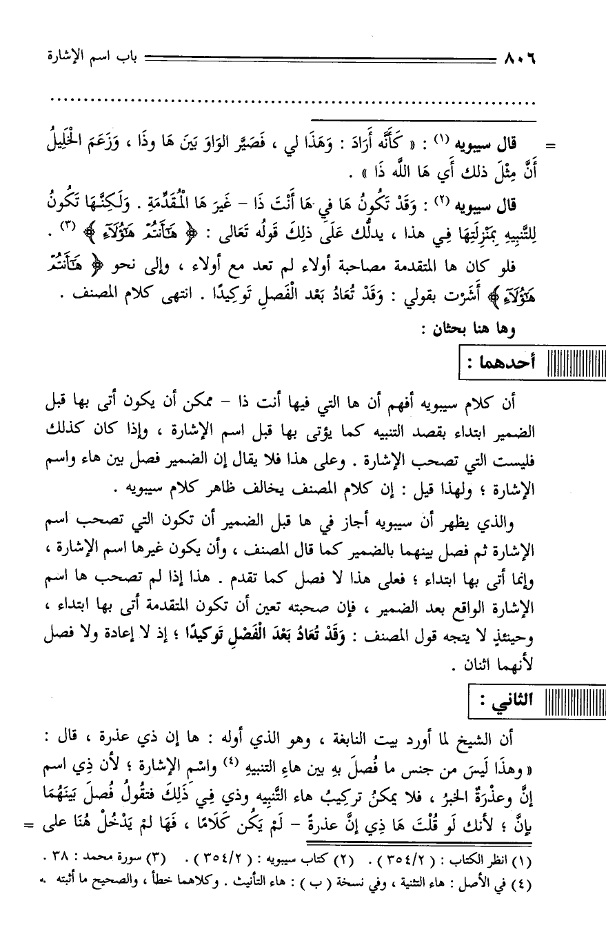 أن كلام سيبويه أفهم أن ها التي فيها أنت ذا - ممكن أن يكون أتى بها قبل الضمير ابتداء بقصد التنبيه كما يؤتى بها قبل اسم الإشارة، وإذا كان كذلك فليست التي تصحب الإشارة. وعلى هذا فلا يقال إن الضمير فصل بين هاء واسم الإشارة؛ ولهذا قيل: إن كلام المصنف يخالف ظاهر كلام سيبويه.