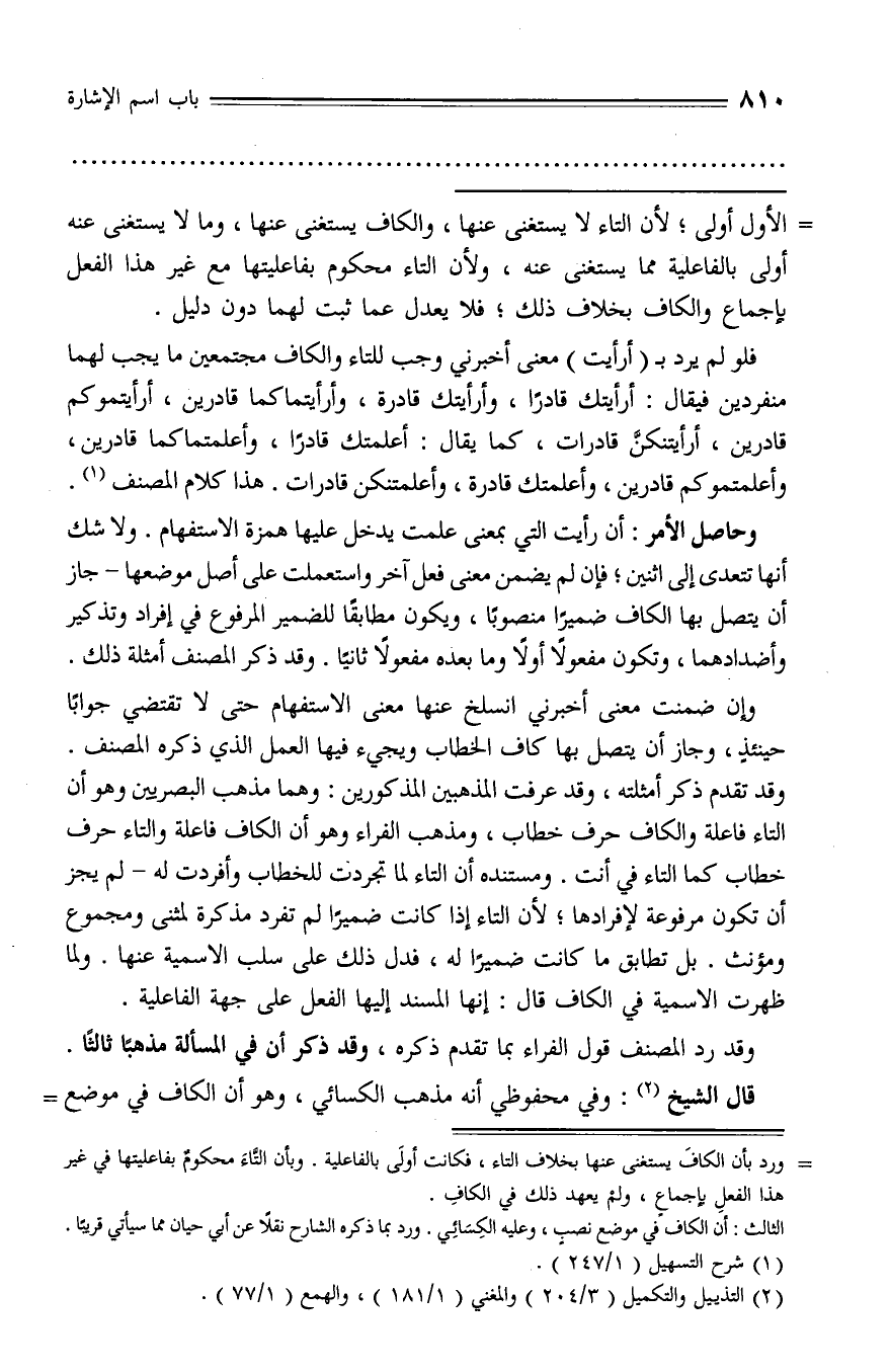 - ورد بأن الكاف يستغنى عنها بخلاف التاء، فكانت أولى بالفاعلية. وبأن التّاء محكوم بفاعليتها في غير هذا الفعل بإجماع، ولم يعهد ذلك في الكاف.