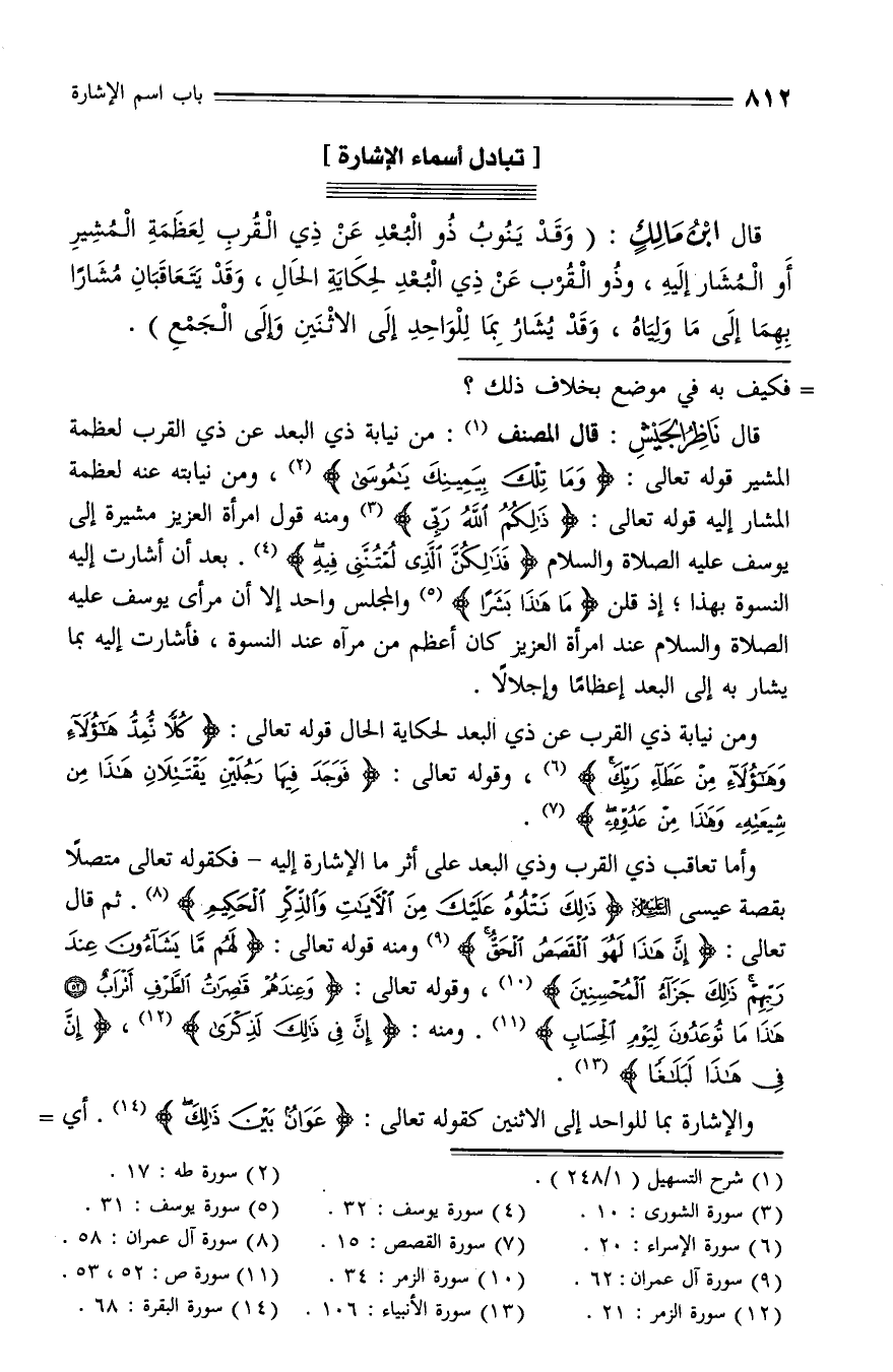 قال ناظر الجيش: قال المصنف (¬1): من نيابة ذي البعد عن ذي القرب لعظمة المشير قوله تعالى: وَما تِلْكَ بِيَمِينِكَ يا مُوسى (¬2)، ومن نيابته عنه لعظمة المشار إليه قوله تعالى: ذلِكُمُ اللَّهُ رَبِّي (¬3) ومنه قول امرأة العزيز مشيرة إلى يوسف عليه الصلاة والسّلام فَذلِكُنَّ الَّذِي لُمْتُنَّنِي فِيهِ (¬4). بعد أن أشارت إليه النسوة بهذا؛ إذ قلن ما هذا بَشَراً (¬5) والمجلس واحد إلا أن مرأى يوسف عليه الصلاة والسّلام عند امرأة العزيز كان أعظم من مرآه عند النسوة، فأشارت إليه بما يشار به إلى البعد إعظاما وإجلالا.
