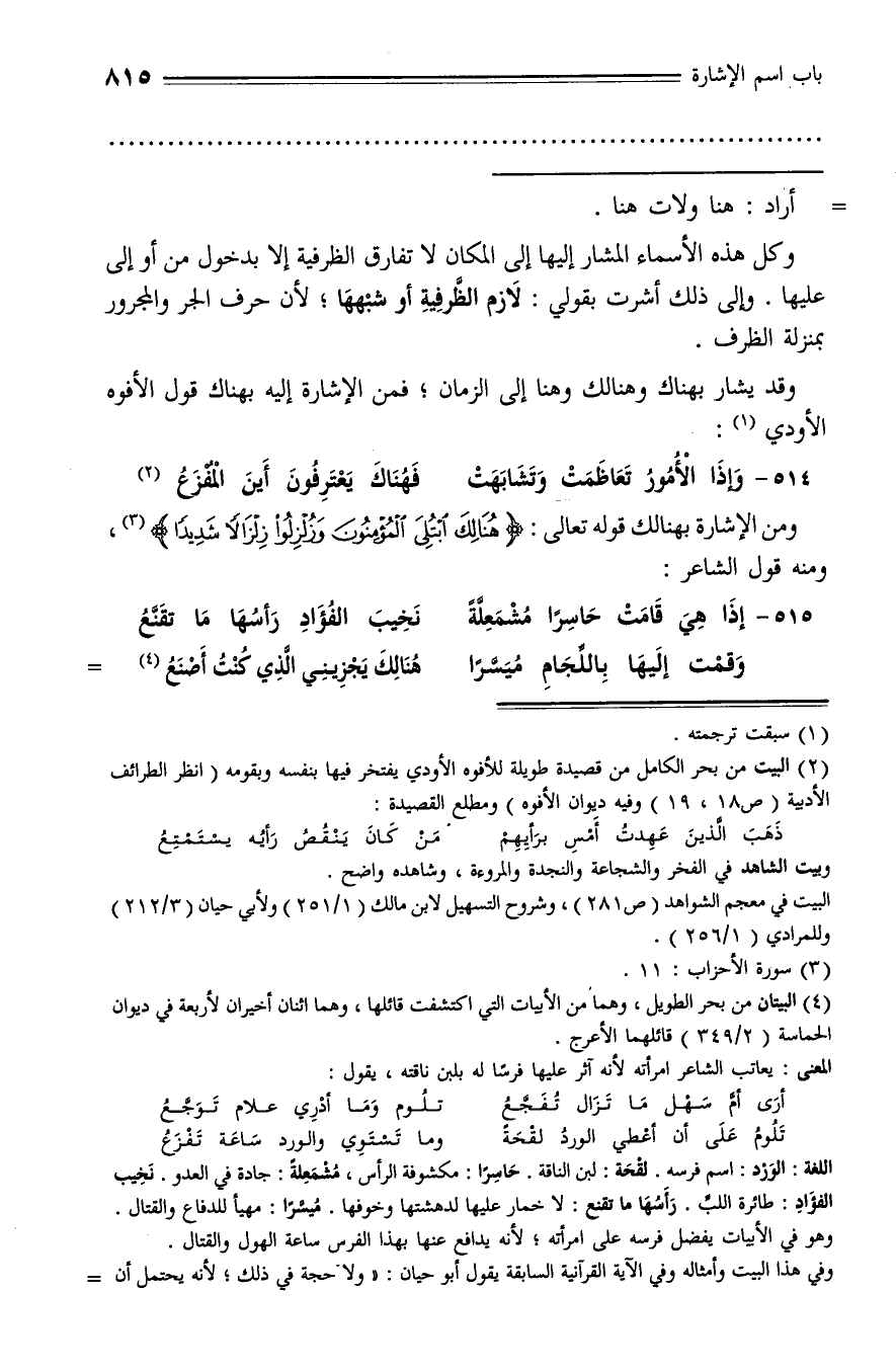 وقد يشار بهناك وهنالك وهنا إلى الزمان؛ فمن الإشارة إليه بهناك قول الأفوه الأودي (¬1):