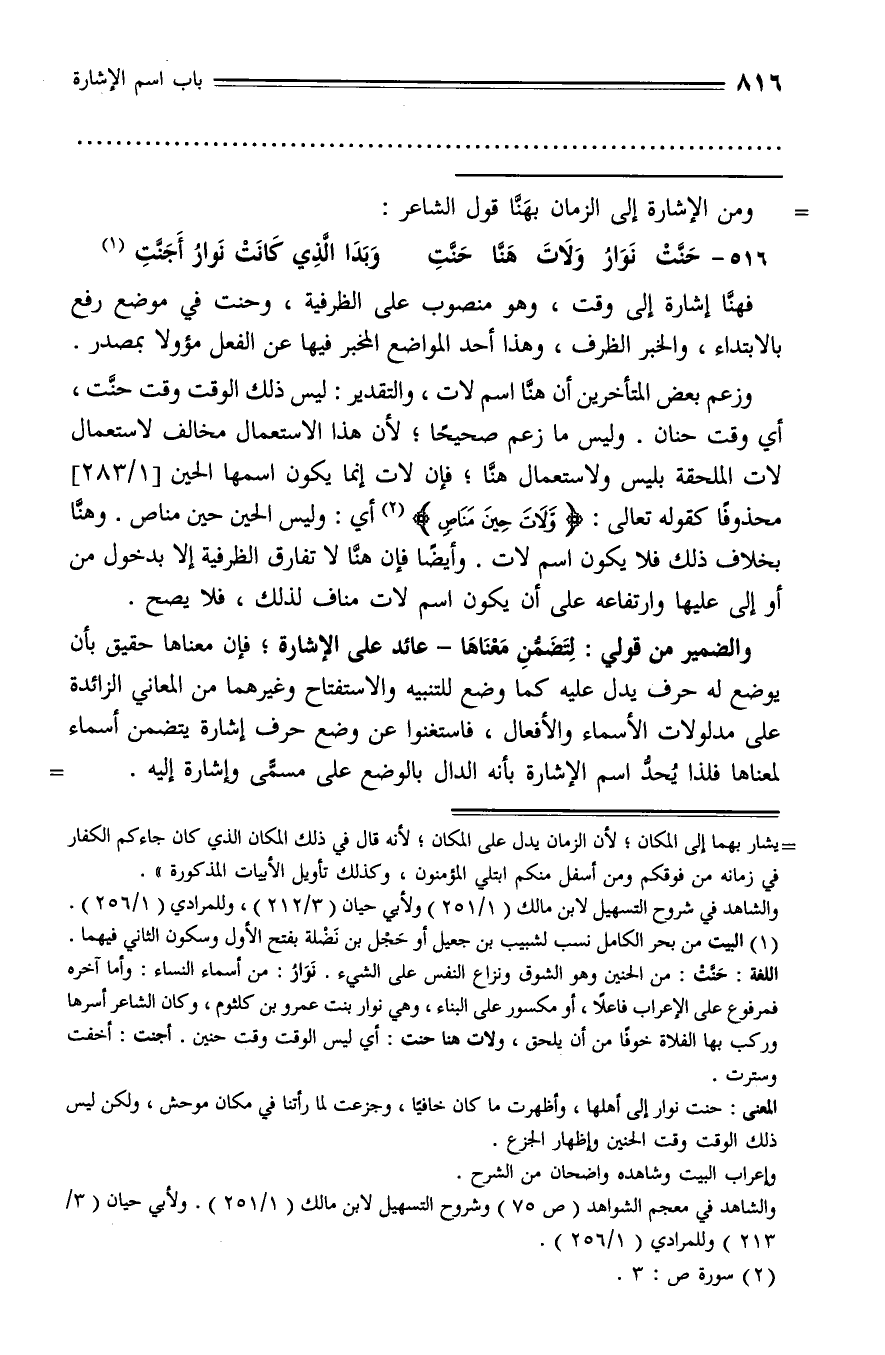 وزعم بعض المتأخرين أن هنّا اسم لات، والتقدير: ليس ذلك الوقت وقت حنّت، أي وقت حنان. وليس ما زعم صحيحا؛ لأن هذا الاستعمال مخالف لاستعمال لات الملحقة بليس ولاستعمال هنّا؛ فإن لات إنما يكون اسمها الحين [1/ 283] محذوفا كقوله تعالى: وَلاتَ حِينَ مَناصٍ (¬2) أي: وليس الحين حين مناص. وهنّا بخلاف ذلك فلا يكون اسم لات. وأيضا فإن هنّا لا تفارق الظرفية إلا بدخول من أو إلى عليها وارتفاعه على أن يكون اسم لات مناف لذلك، فلا يصح.