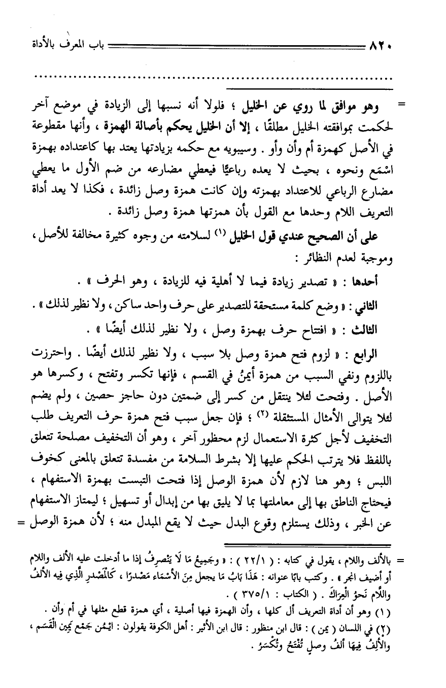 وهو موافق لما روي عن الخليل؛ فلولا أنه نسبها إلى الزيادة في موضع آخر لحكمت بموافقته الخليل مطلقا، إلا أن الخليل يحكم بأصالة الهمزة، وأنها مقطوعة في الأصل كهمزة أم وأن وأو. وسيبويه مع حكمه بزيادتها يعتد بها كاعتداده بهمزة اسمع ونحوه، بحيث لا يعده رباعيّا فيعطي مضارعه من ضم الأول ما يعطي مضارع الرباعي للاعتداد بهمزته وإن كانت همزة وصل زائدة، فكذا لا يعد أداة التعريف اللام وحدها مع القول بأن همزتها همزة وصل زائدة.