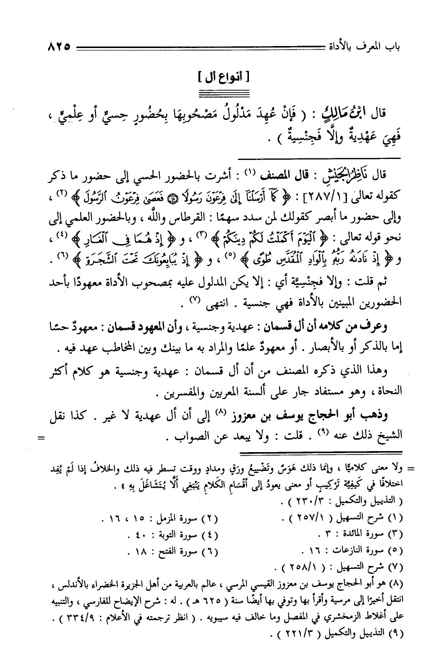 وذهب أبو الحجاج يوسف بن معزوز (¬8) إلى أن أل عهدية لا غير. كذا نقل الشيخ ذلك عنه (¬9). قلت: ولا يبعد عن الصواب. -