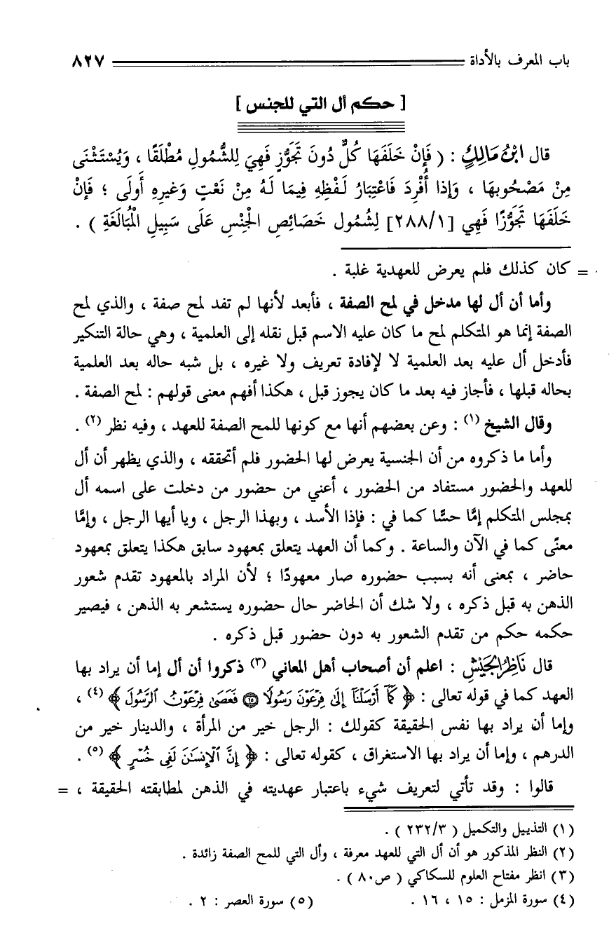 وأما ما ذكروه من أن الجنسية يعرض لها الحضور فلم أتحققه، والذي يظهر أن أل للعهد والحضور مستفاد من الحضور، أعني من حضور من دخلت على اسمه أل بمجلس المتكلم إمّا حسّا كما في: فإذا الأسد، وبهذا الرجل، ويا أيها الرجل، وإمّا معنى كما في الآن والساعة. وكما أن العهد يتعلق بمعهود سابق هكذا يتعلق بمعهود حاضر، بمعنى أنه بسبب حضوره صار معهودا؛ لأن المراد بالمعهود تقدم شعور الذهن به قبل ذكره، ولا شك أن الحاضر حال حضوره يستشعر به الذهن، فيصير حكمه حكم من تقدم الشعور به دون حضور قبل ذكره.