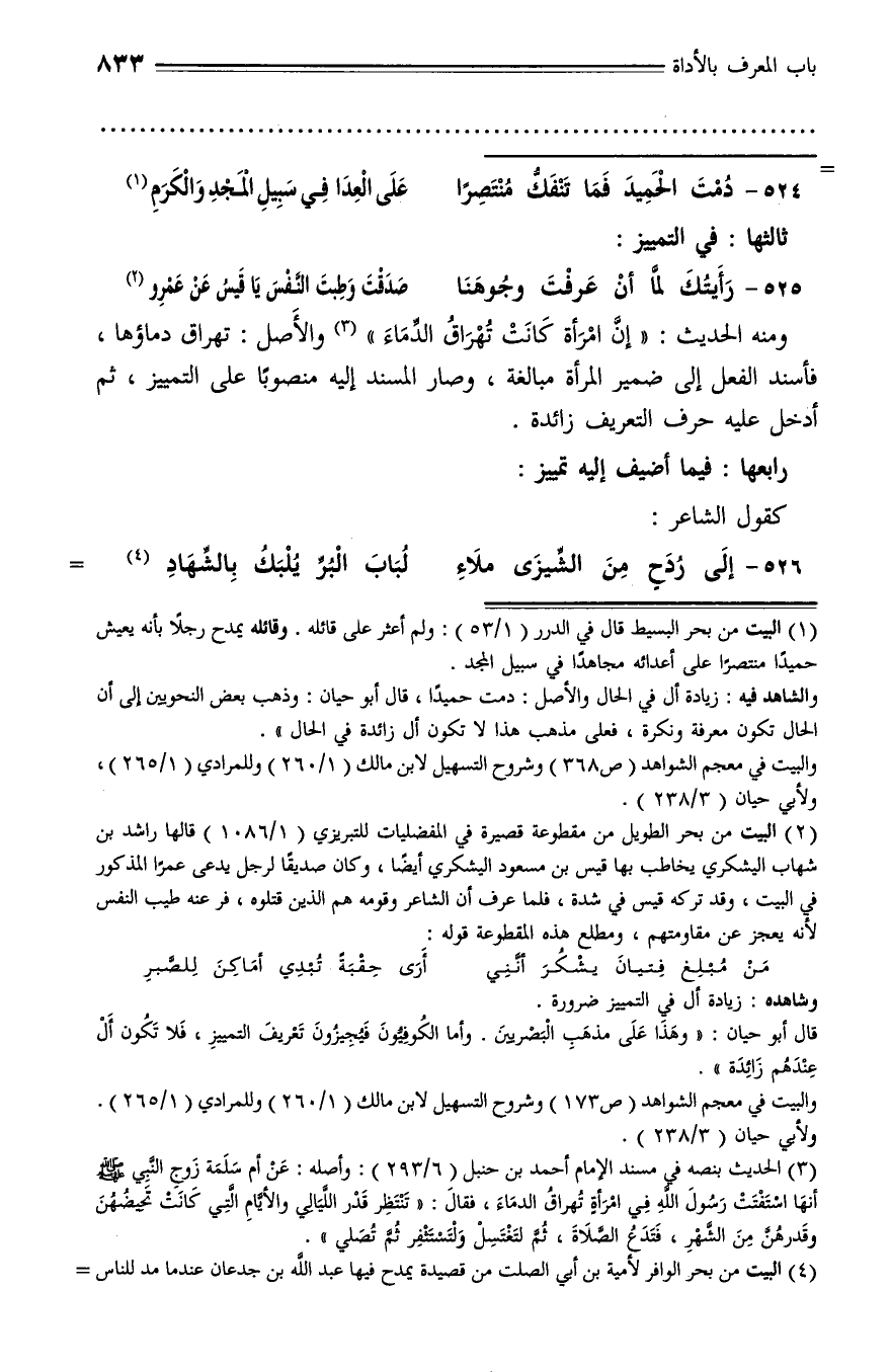 والشاهد فيه: زيادة أل في الحال والأصل: دمت حميدا، قال أبو حيان: وذهب بعض النحويين إلى أن الحال تكون معرفة ونكرة، فعلى مذهب هذا لا تكون أل زائدة في الحال».