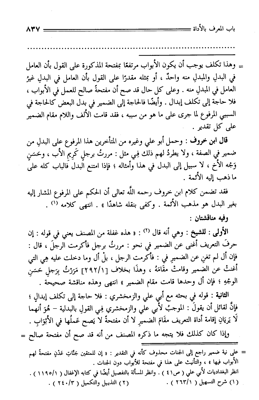 الثانية: قوله في بحثه مع أبي علي والزمخشري: فلا حاجة إلى تكلف إبدال؛ فإنّ لقائل أن يقول: الموجب لأبي علي والزمخشري في القول بالبدلية - هو أنهما لا يريان إقامة أداة التعريف مقام الضمير لا أن مفتحة لا يصح عملها في الأبواب.