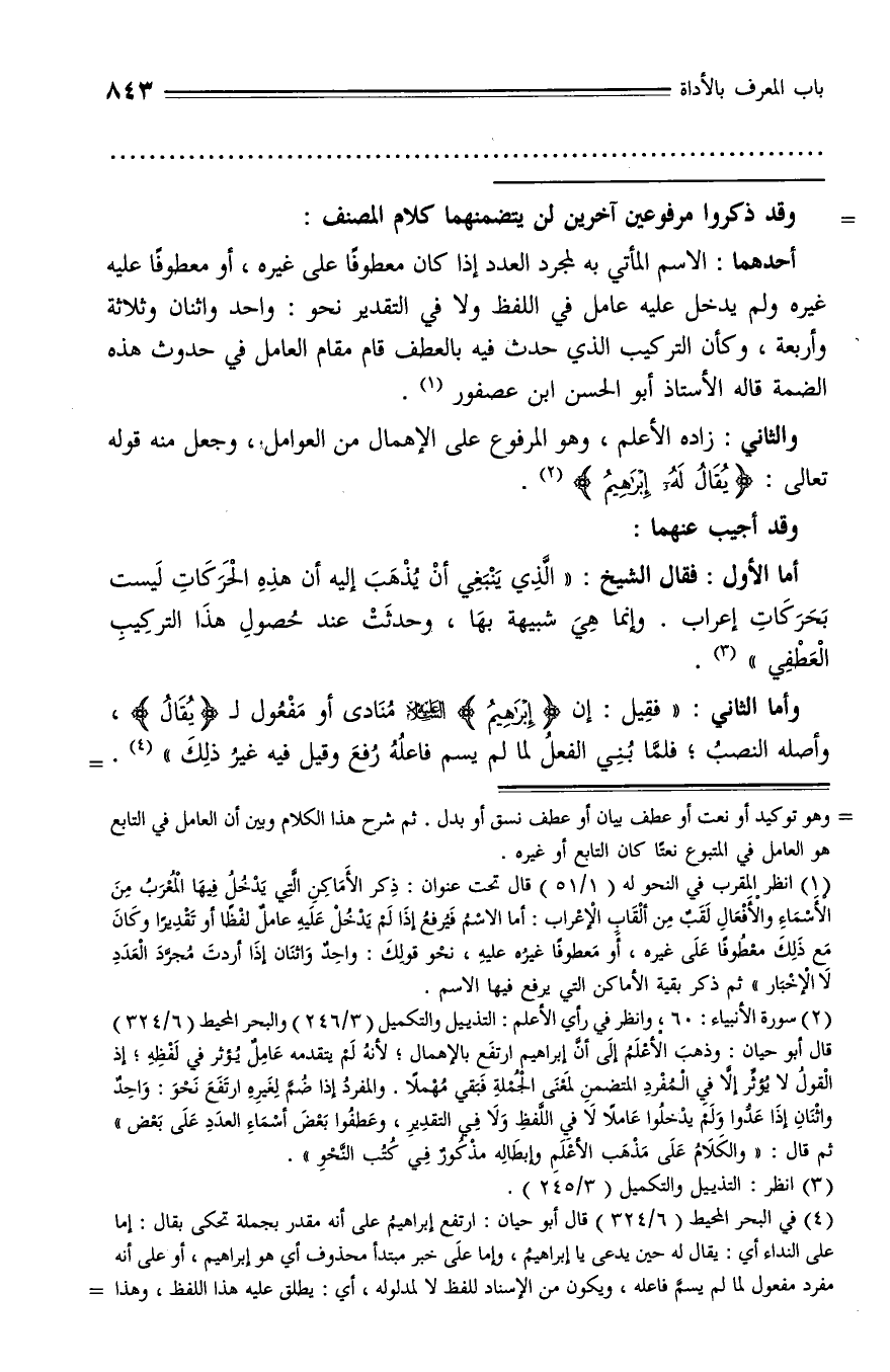 أما الأول: فقال الشيخ: «الّذي ينبغي أن يذهب إليه أن هذه الحركات ليست بحركات إعراب. وإنما هي شبيهة بها، وحدثت عند حصول هذا التركيب العطفي» (¬3).