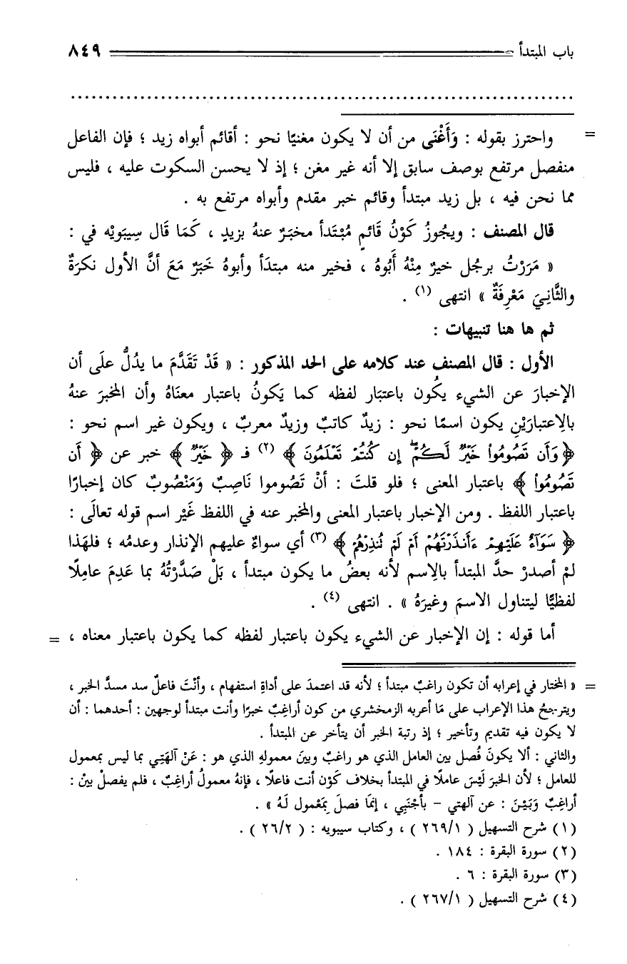 الأول: قال المصنف عند كلامه على الحد المذكور: «قد تقدّم ما يدلّ على أن الإخبار عن الشيء يكون باعتبار لفظه كما يكون باعتبار معناه وأن المخبر عنه بالاعتبارين يكون اسما نحو: زيد كاتب وزيد معرب، ويكون غير اسم نحو:
