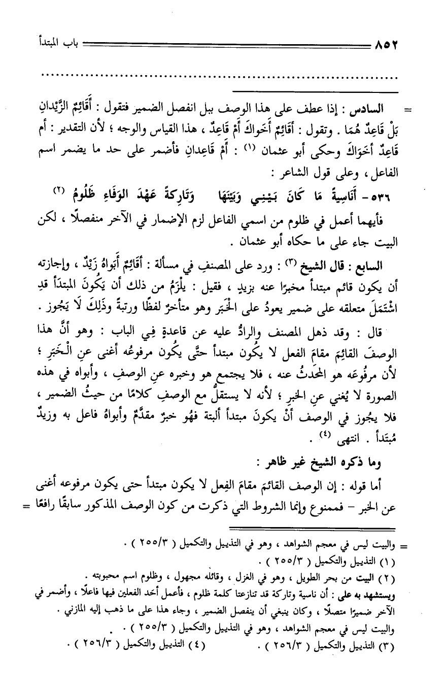 السادس: إذا عطف على هذا الوصف ببل انفصل الضمير فتقول: أقائم الزّيدان بل قاعدهما. وتقول: أقائم أخواك أم قاعد، هذا القياس والوجه؛ لأن التقدير: أم قاعد أخواك وحكى أبو عثمان (¬1): أم قاعدان فأضمر على حد ما يضمر اسم الفاعل، وعلى قول الشاعر: