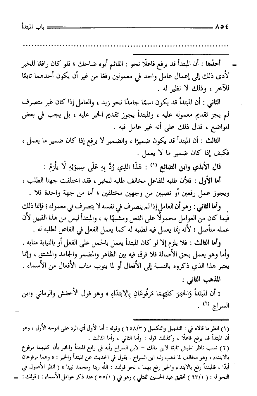 (¬1) انظر ما قالاه في: التذييل والتكميل (3/ 258) وقوله: أما الأول أي الرد على الوجه الأول، وهو أن المبتدأ قد يرفع فاعلا، وكذلك قوله: وأما الثاني، وأما الثالث.