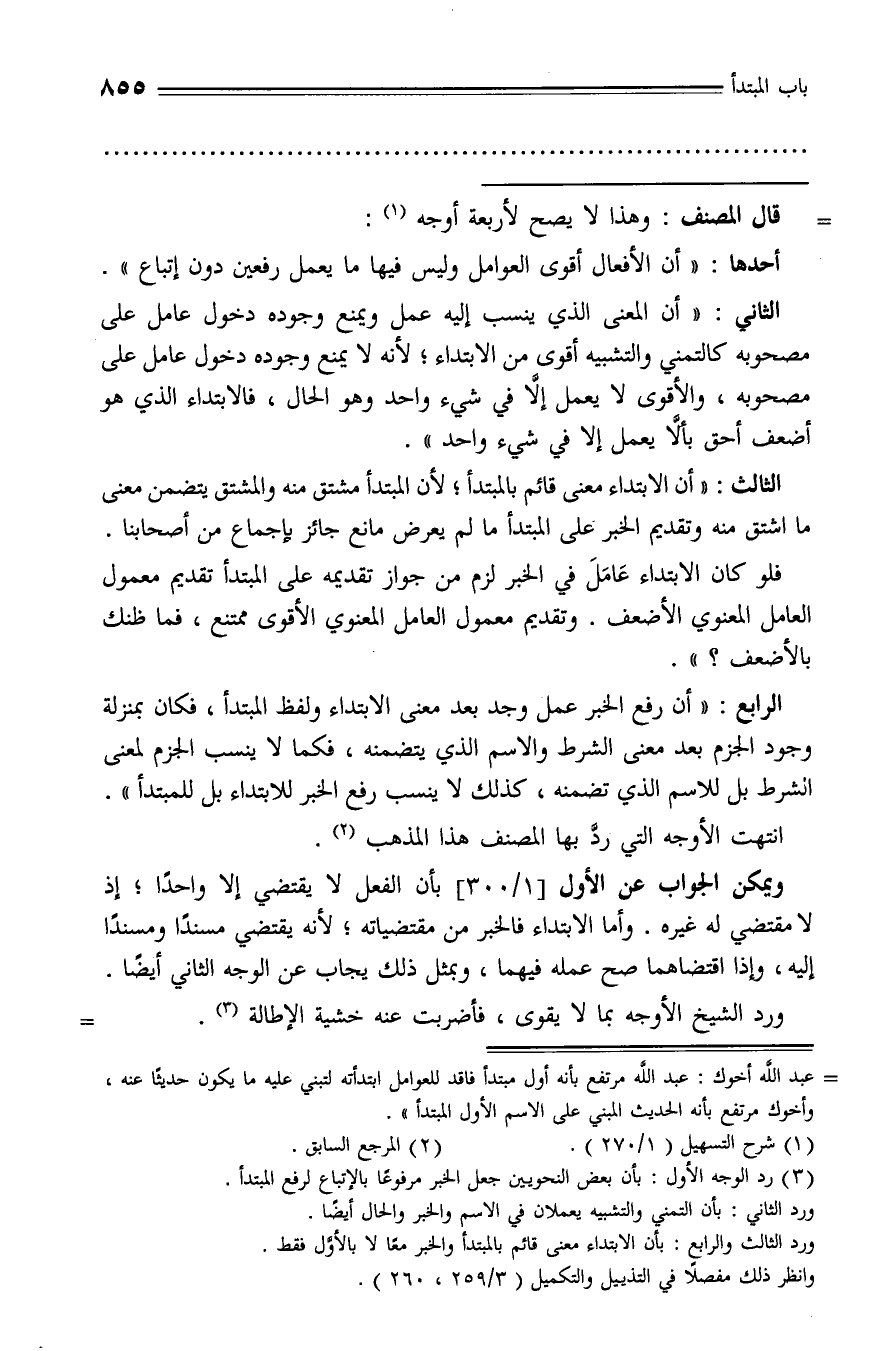 ويمكن الجواب عن الأول [1/ 300] بأن الفعل لا يقتضي إلا واحدا؛ إذ لا مقتضي له غيره. وأما الابتداء فالخبر من مقتضياته؛ لأنه يقتضي مسندا ومسندا إليه، وإذا اقتضاهما صح عمله فيهما، وبمثل ذلك يجاب عن الوجه الثاني أيضا.