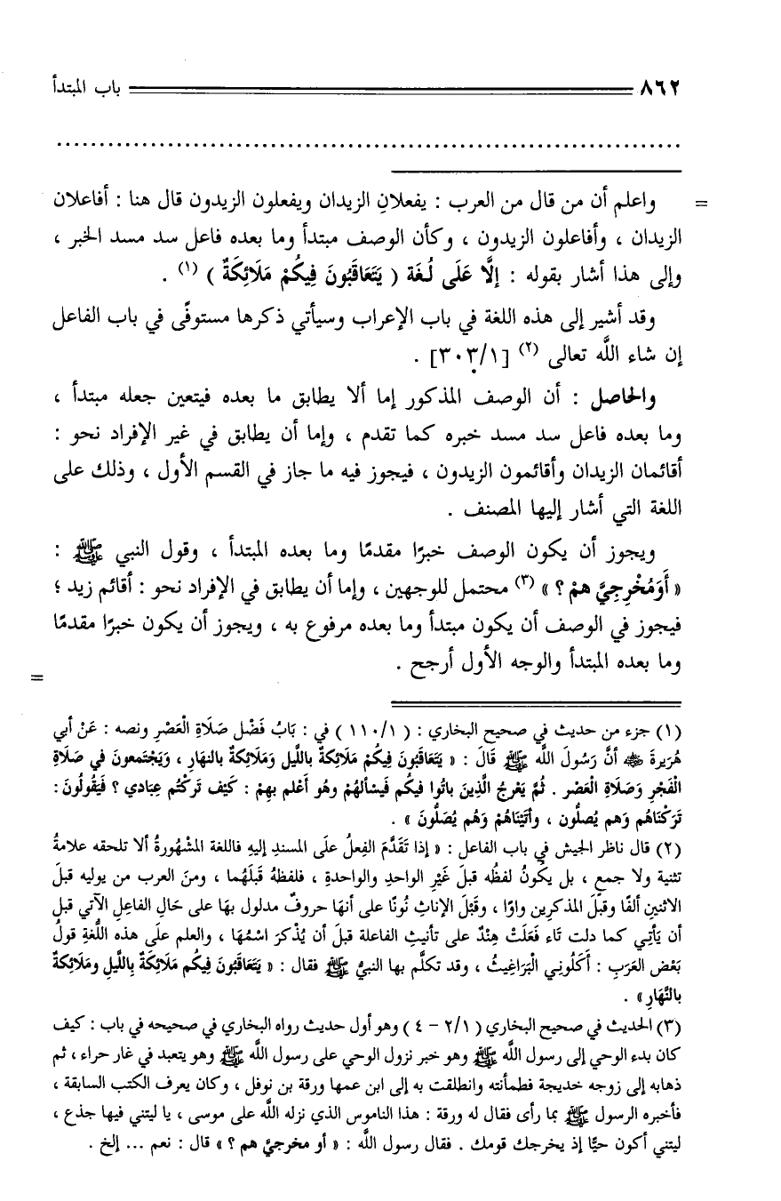 (¬2) قال ناظر الجيش في باب الفاعل: «إذا تقدّم الفعل على المسند إليه فاللغة المشهورة ألا تلحقه علامة تثنية ولا جمع، بل يكون لفظه قبل غير الواحد والواحدة، فلفظه قبلهما، ومن العرب من يوليه قبل الاثنين ألفا وقبل المذكرين واوا، وقبل الإناث نونا على أنها حروف مدلول بها على حال الفاعل الآتي قبل أن يأتي كما دلت تاء فعلت هند على تأنيث الفاعلة قبل أن يذكر اسمها، والعلم على هذه اللّغة قول بعض العرب: أكلوني البراغيث، وقد تكلّم بها النبيّ صلّى الله عليه وسلّم فقال: «يتعاقبون فيكم ملائكة باللّيل وملائكة بالنّهار».