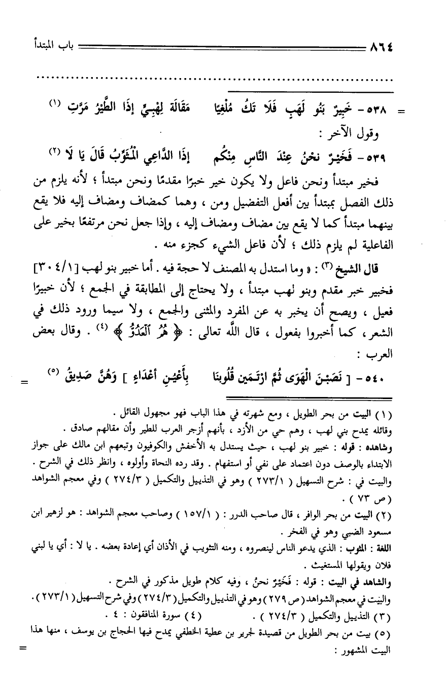 وشاهده: قوله: خبير بنو لهب، حيث يستدل به الأخفش والكوفيون وتبعهم ابن مالك على جواز الابتداء بالوصف دون اعتماد على نفي أو استفهام. وقد رده النحاة وأولوه، وانظر ذلك في الشرح.