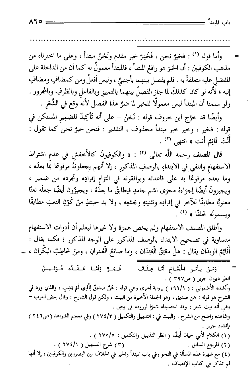 (¬4) مع شهرة هذه المسألة في النحو وفي باب المبتدأ والخبر في الخلاف بين البصريين والكوفيين، إلا أنها لم تذكر في كتاب الإنصاف.