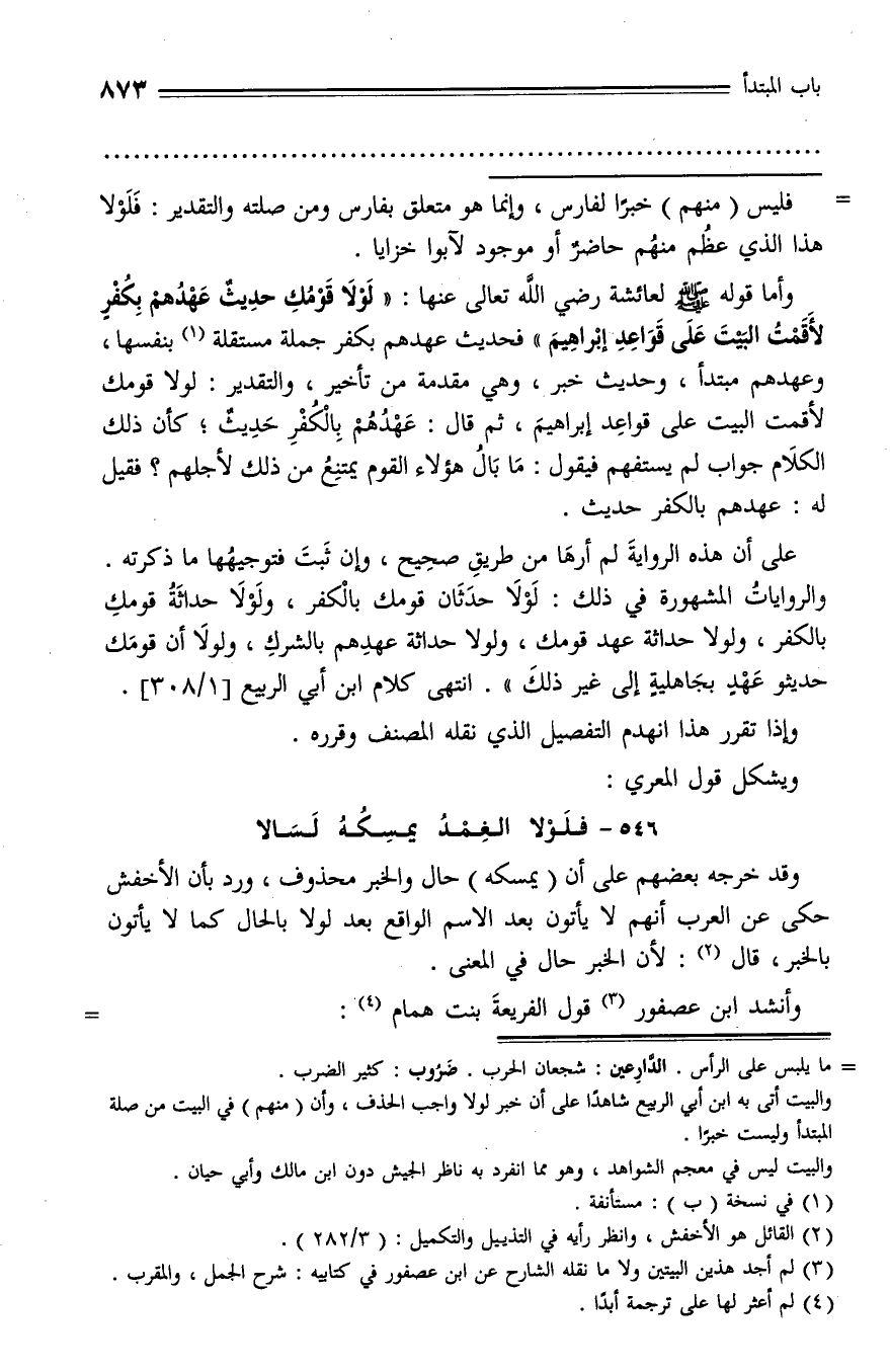 وأما قوله صلّى الله عليه وسلّم لعائشة رضي الله تعالى عنها: «لولا قومك حديث عهدهم بكفر لأقمت البيت على قواعد إبراهيم» فحديث عهدهم بكفر جملة مستقلة (¬1) بنفسها، وعهدهم مبتدأ، وحديث خبر، وهي مقدمة من تأخير، والتقدير: لولا قومك لأقمت البيت على قواعد إبراهيم، ثم قال: عهدهم بالكفر حديث؛ كأن ذلك الكلام جواب لم يستفهم فيقول: ما بال هؤلاء القوم يمتنع من ذلك لأجلهم؟ فقيل له: عهدهم بالكفر حديث.