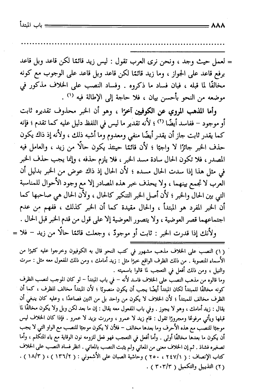 لعمل حيث وجد، ونحن نرى العرب تقول: ليس زيد قائما لكن قاعد وبل قاعد برفع قاعد على الجواز، وما زيد قائما لكن قاعد وبل قاعد على الوجوب مع كونه مخالفا لما قبله، فبان فساد ما ذكروه. وفساد النصب على الخلاف مذكور في موضعه من النحو بأحسن بيان، فلا حاجة إلى الإطالة فيه (¬1).