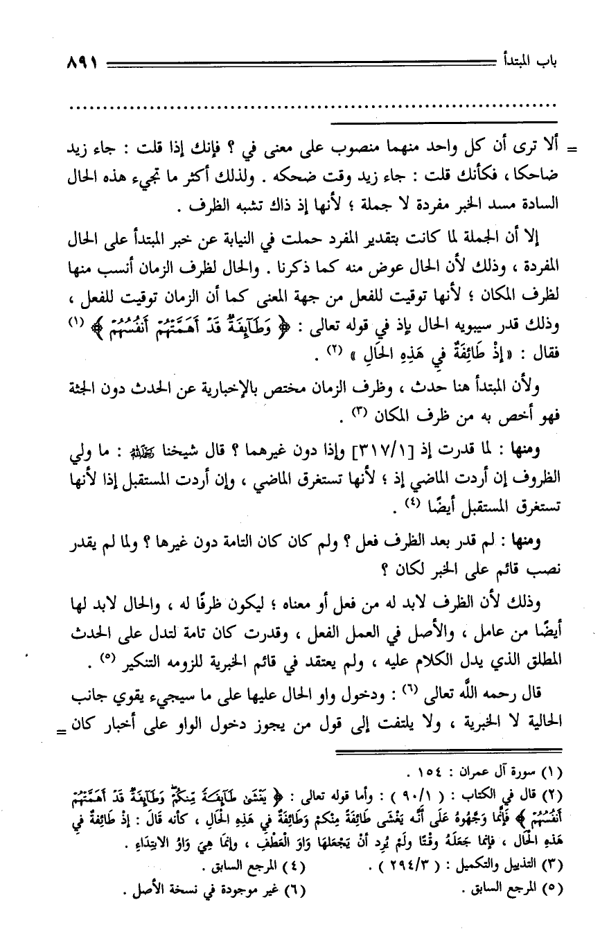 (¬2) قال في الكتاب: (1/ 90): وأما قوله تعالى: يَغْشى طائِفَةً مِنْكُمْ وَطائِفَةٌ قَدْ أَهَمَّتْهُمْ أَنْفُسُهُمْ فإنّما وجّهوه على أنّه يغشى طائفة منكم وطائفة في هذه الحال، كأنه قال: إذ طائفة في هذه الحال، فإنما جعله وقتا ولم يرد أن يجعلها واو العطف، وإنما هي واو الابتداء.