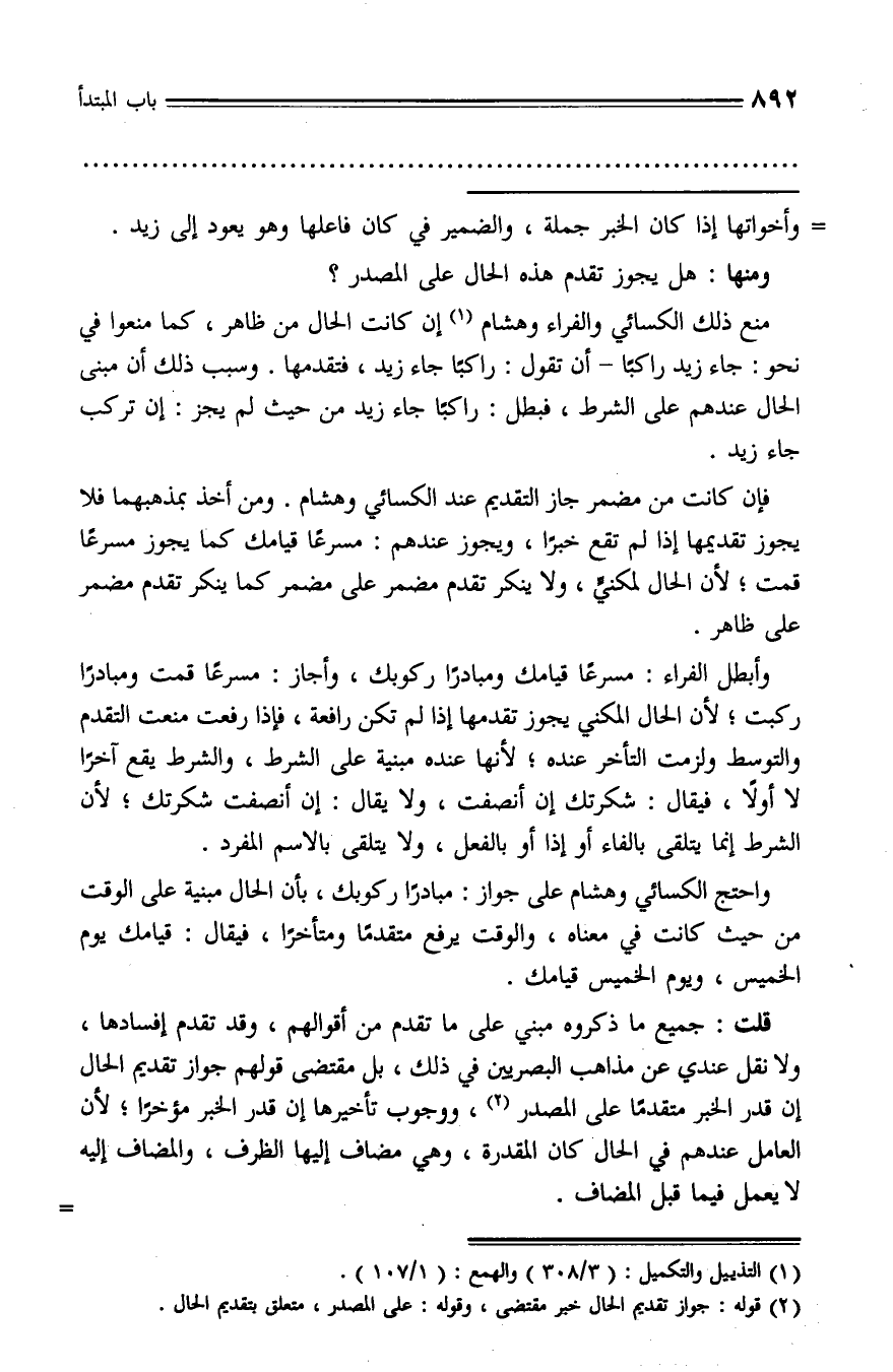 وأبطل الفراء: مسرعا قيامك ومبادرا ركوبك، وأجاز: مسرعا قمت ومبادرا ركبت؛ لأن الحال المكني يجوز تقدمها إذا لم تكن رافعة، فإذا رفعت منعت التقدم والتوسط ولزمت التأخر عنده؛ لأنها عنده مبنية على الشرط، والشرط يقع آخرا لا أولا، فيقال: شكرتك إن أنصفت، ولا يقال: إن أنصفت شكرتك؛ لأن الشرط إنما يتلقى بالفاء أو إذا أو بالفعل، ولا يتلقى بالاسم المفرد.