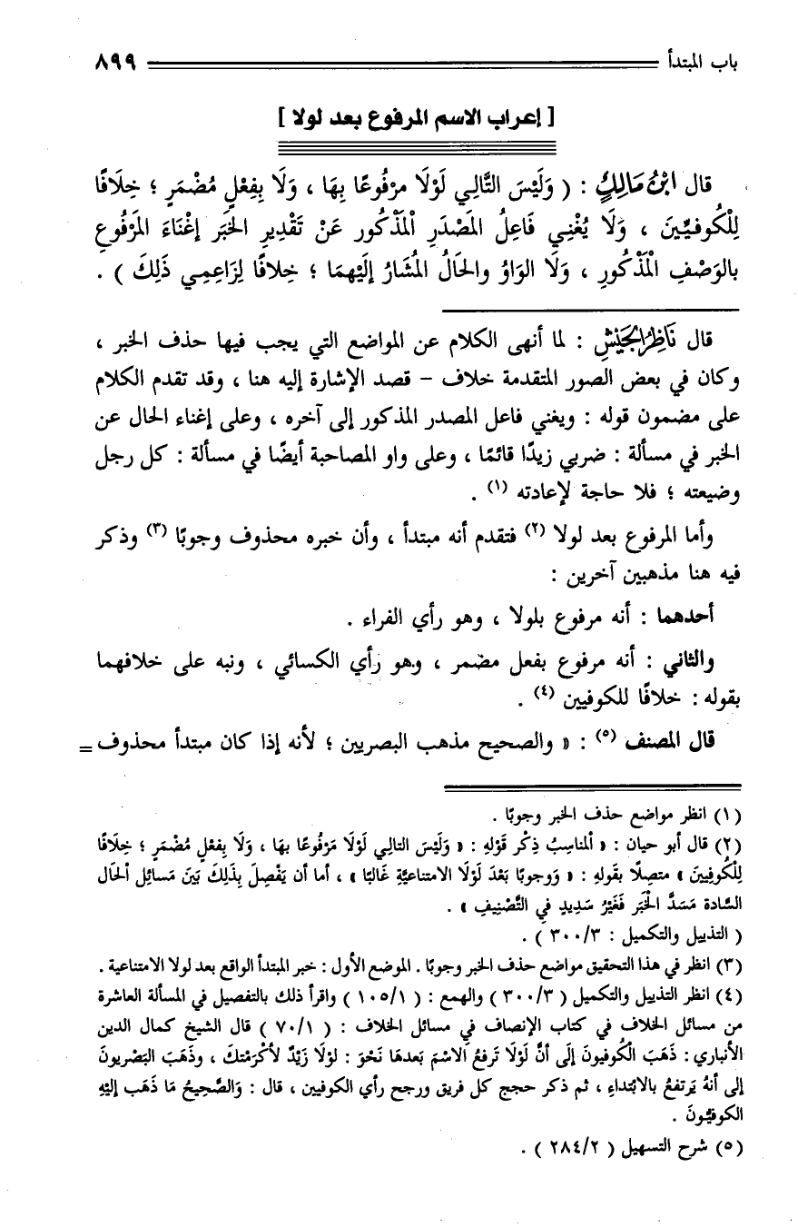 (¬4) انظر التذييل والتكميل (3/ 300) والهمع: (1/ 105) واقرأ ذلك بالتفصيل في المسألة العاشرة من مسائل الخلاف في كتاب الإنصاف في مسائل الخلاف: (1/ 70) قال الشيخ كمال الدين الأنباري: ذهب الكوفيون إلى أنّ لولا ترفع الاسم بعدها نحو: لولا زيد لأكرمتك، وذهب البصريون إلى أنه يرتفع بالابتداء، ثم ذكر حجج كل فريق ورجح رأي الكوفيين، قال: والصّحيح ما ذهب إليه الكوفيّون.