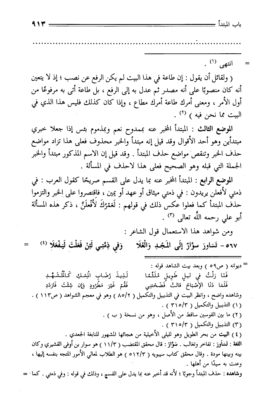 وشاهده: حذف المبتدأ وجوبا؛ لأنه قد أخبر عنه بما يدل على القسم، وذلك في قوله: وفي ذمتي. كما -