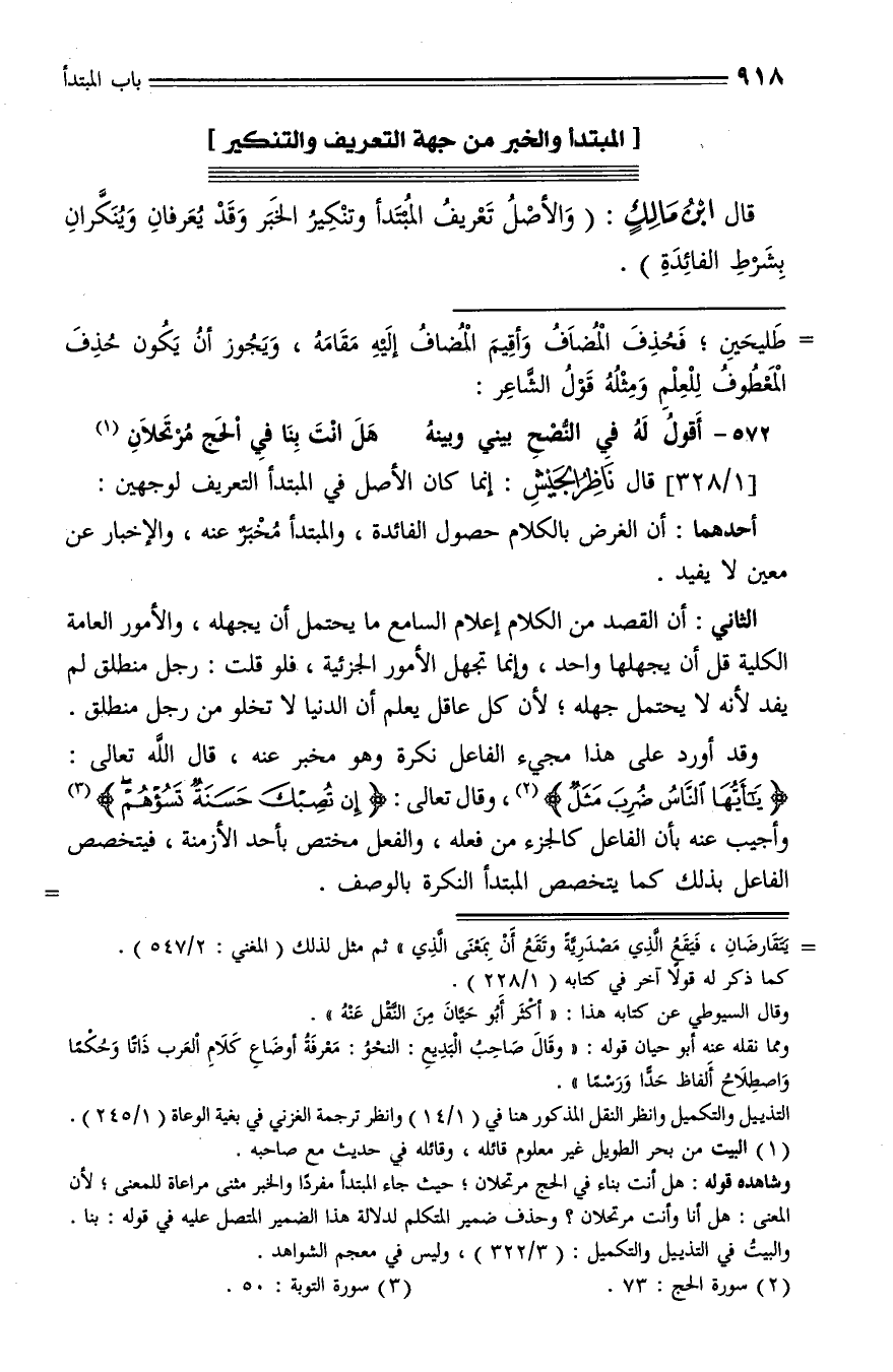 وشاهده قوله: هل أنت بناء في الحج مرتحلان؛ حيث جاء المبتدأ مفردا والخبر مثنى مراعاة للمعنى؛ لأن المعنى: هل أنا وأنت مرتحلان؟ وحذف ضمير المتكلم لدلالة هذا الضمير المتصل عليه في قوله: بنا.