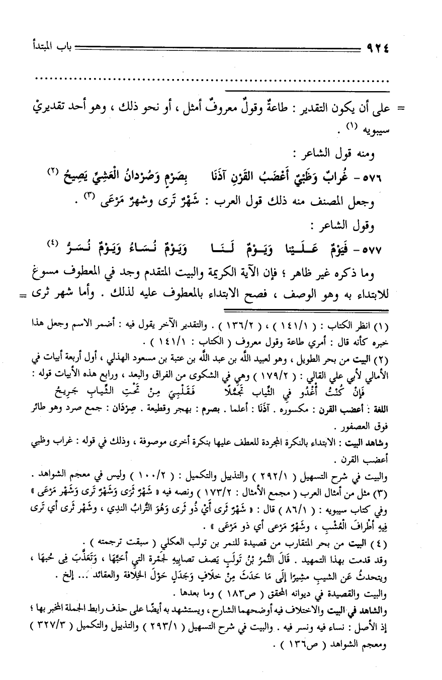 وشاهد البيت: الابتداء بالنكرة المجردة للعطف عليها بنكرة أخرى موصوفة، وذلك في قوله: غراب وظبي أعضب القرن.