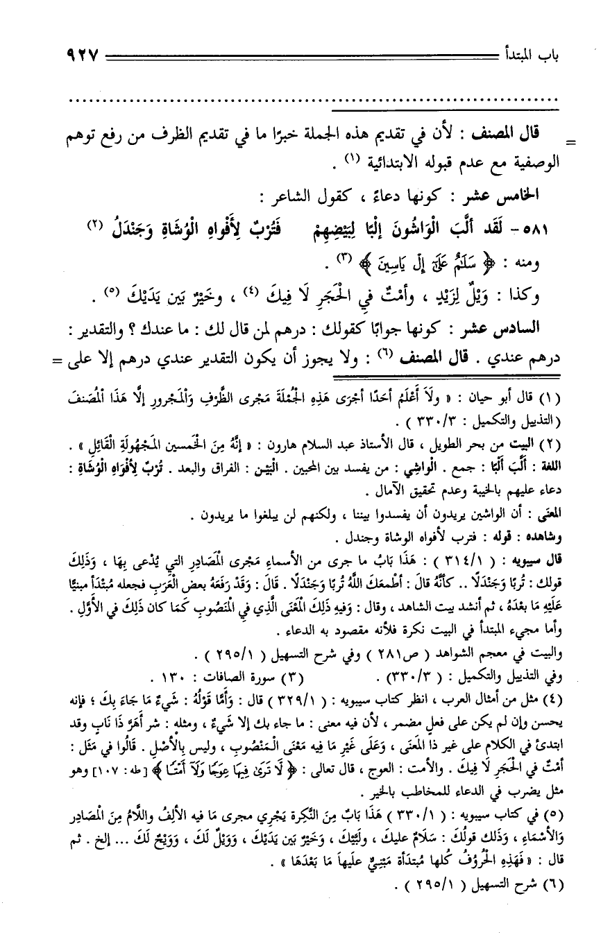 (¬5) في كتاب سيبويه: (1/ 330) هذا باب من النّكرة يجري مجرى ما فيه الألف واللّام من المصادر والأسماء، وذلك قولك: سلام عليك، ولبّيك، وخير بين يديك، وويل لك، وويح لك ... إلخ. ثم قال: «فهذه الحروف كلها مبتدأة مبنيّ عليها ما بعدها».