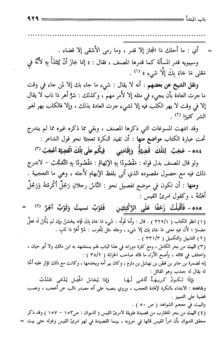 (¬1) انظر الكتاب (1/ 329). قال: وأما قوله: شيء ما جاء بك فإنه يحسن وإن لم يكن له فعل مضمر؛ لأن فيه معنى ما جاء بك إلا شيء، ومثله مثل للعرب: شرّ أهرّ ذا ناب.
