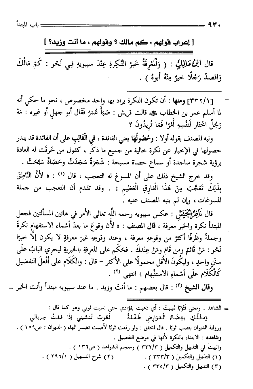 قال ابن مالك: (والمعرفة خبر النّكرة عند سيبويه في نحو: كم مالك واقصد رجلا خير منه أبوه).