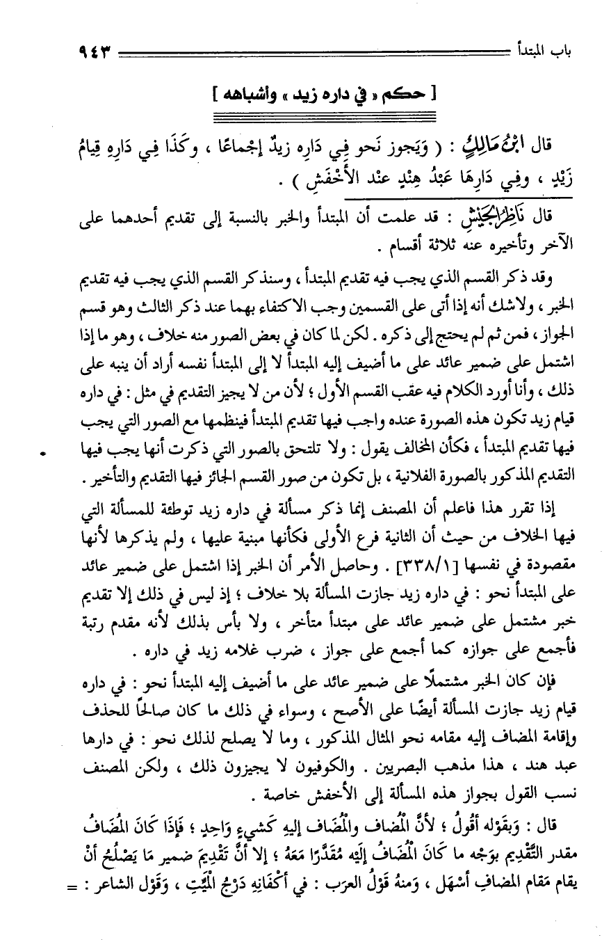 إذا تقرر هذا فاعلم أن المصنف إنما ذكر مسألة في داره زيد توطئة للمسألة التي فيها الخلاف من حيث أن الثانية فرع الأولى فكأنها مبنية عليها، ولم يذكرها لأنها مقصودة في نفسها [1/ 338]. وحاصل الأمر أن الخبر إذا اشتمل على ضمير عائد على المبتدأ نحو: في داره زيد جازت المسألة بلا خلاف؛ إذ ليس في ذلك إلا تقديم خبر مشتمل على ضمير عائد على مبتدأ متأخر، ولا بأس بذلك لأنه مقدم رتبة فأجمع على جوازه كما أجمع على جواز، ضرب غلامه زيد في داره.