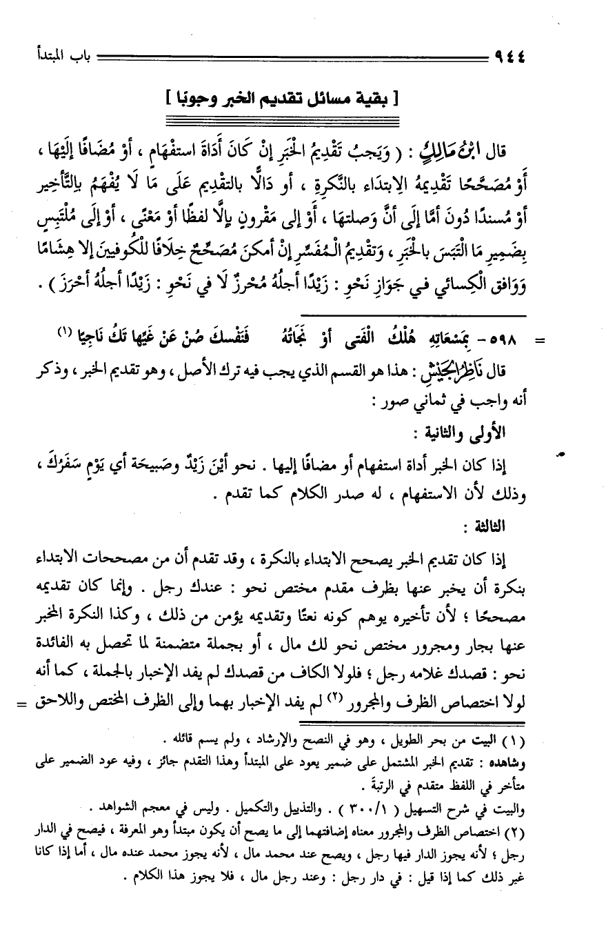 قال ابن مالك: (ويجب تقديم الخبر إن كان أداة استفهام، أو مضافا إليها، أو مصحّحا تقديمه الابتداء بالنّكرة، أو دالّا بالتقديم على ما لا يفهم بالتّأخير أو مسندا دون أمّا إلى أنّ وصلتها، أو إلى مقرون بإلّا لفظا أو معنى، أو إلى ملتبس بضمير ما التبس بالخبر، وتقديم المفسّر إن أمكن مصحّح خلافا للكوفيين إلا هشاما ووافق الكسائي في جواز نحو: زيدا أجله محرز لا في نحو: زيدا أجله أحرز).