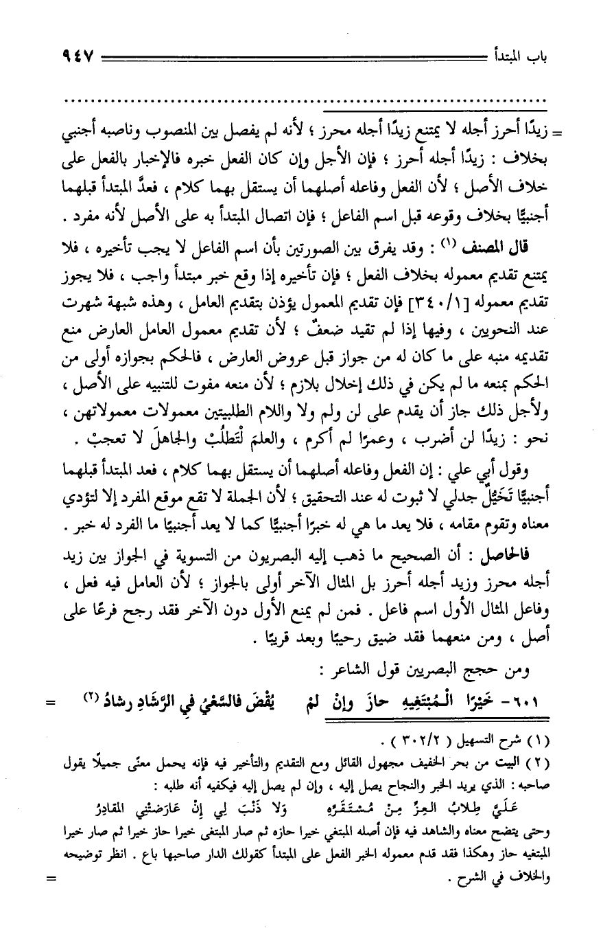 فالحاصل: أن الصحيح ما ذهب إليه البصريون من التسوية في الجواز بين زيد أجله محرز وزيد أجله أحرز بل المثال الآخر أولى بالجواز؛ لأن العامل فيه فعل، وفاعل المثال الأول اسم فاعل. فمن لم يمنع الأول دون الآخر فقد رجح فرعا على أصل، ومن منعهما فقد ضيق رحيبا وبعد قريبا.
