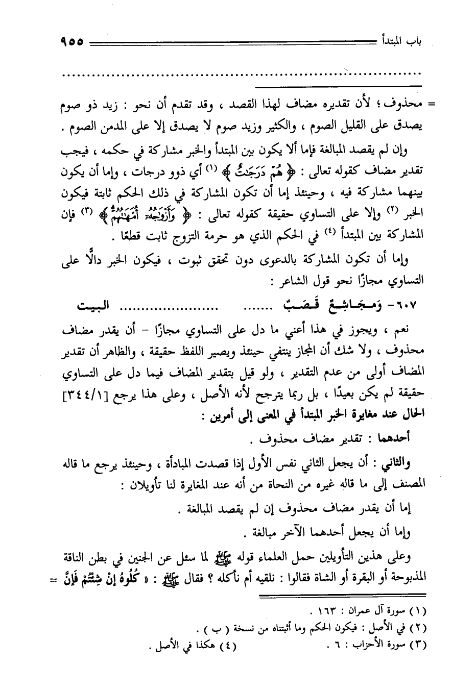 وإن لم يقصد المبالغة فإما ألا يكون بين المبتدأ والخبر مشاركة في حكمه، فيجب تقدير مضاف كقوله تعالى: هُمْ دَرَجاتٌ (¬1) أي ذو ودرجات، وإما أن يكون بينهما مشاركة فيه، وحينئذ إما أن تكون المشاركة في ذلك الحكم ثابتة فيكون الخبر (¬2) وإلا على التساوي حقيقة كقوله تعالى: وَأَزْواجُهُ أُمَّهاتُهُمْ (¬3) فإن المشاركة بين المبتدأ (¬4) في الحكم الذي هو حرمة التزوج ثابت قطعا.